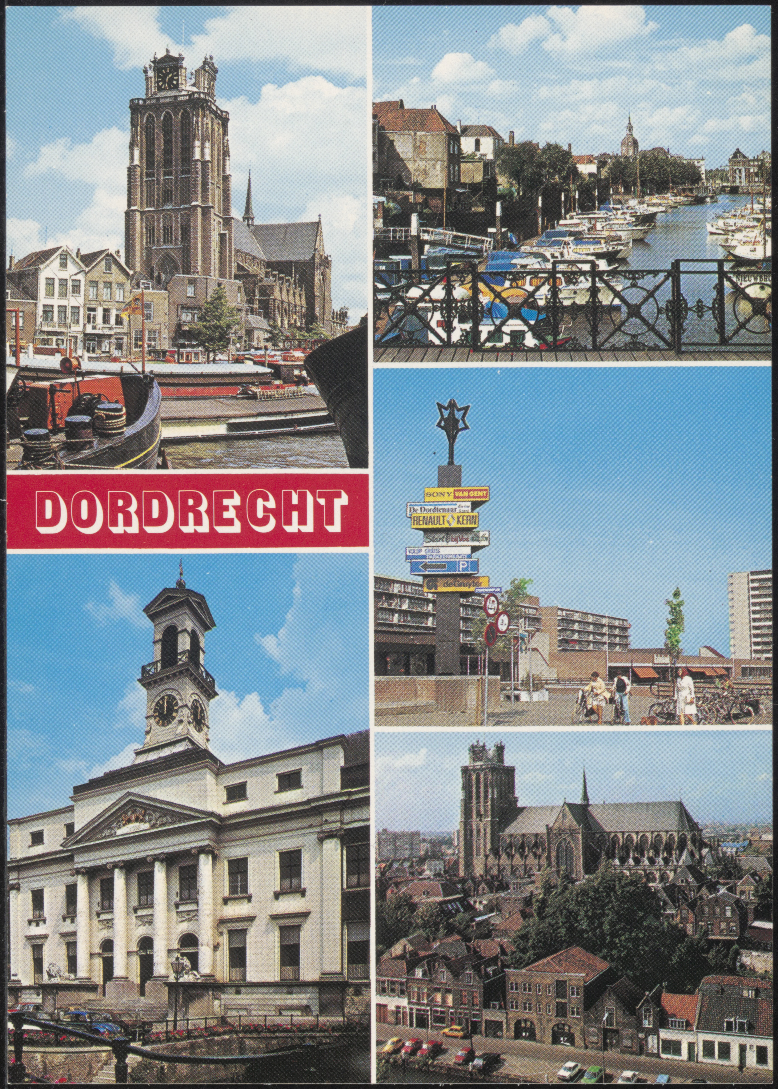 LB: Bomhaven Grote kerk. RB: Wijnhaven met Grote Kerk. MR: Winkelcentrum Sterrenburg. LO: Stadhuis. RO: Grote Kerk.