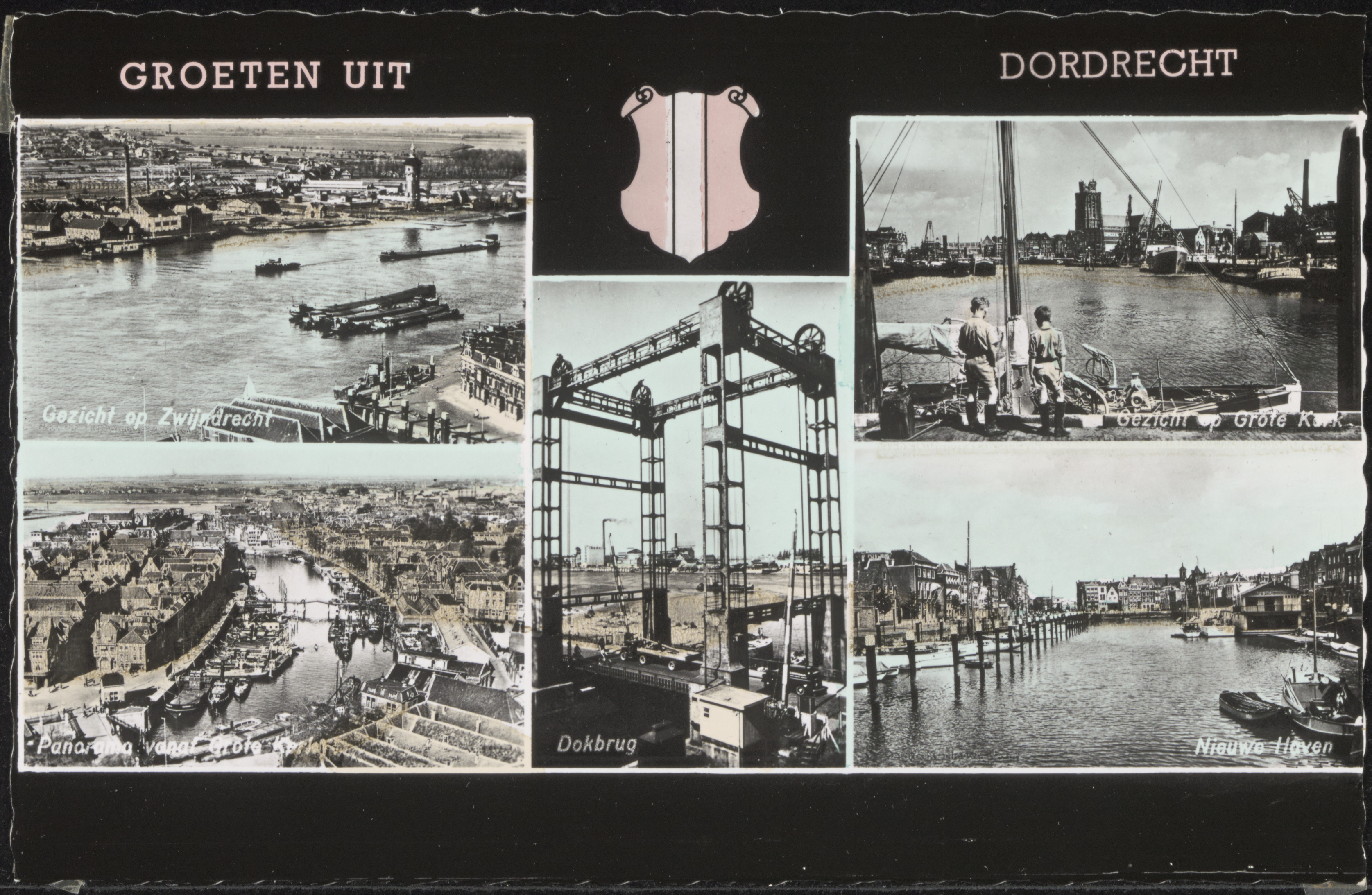 LB: Gezicht op Zwijndrecht. RB: Kalkhaven met Grote Kerk. LO: Vanaf Grote Kerk de Nieuwe Haven. RO: Nieuwe Haven. M: Dokbrug.