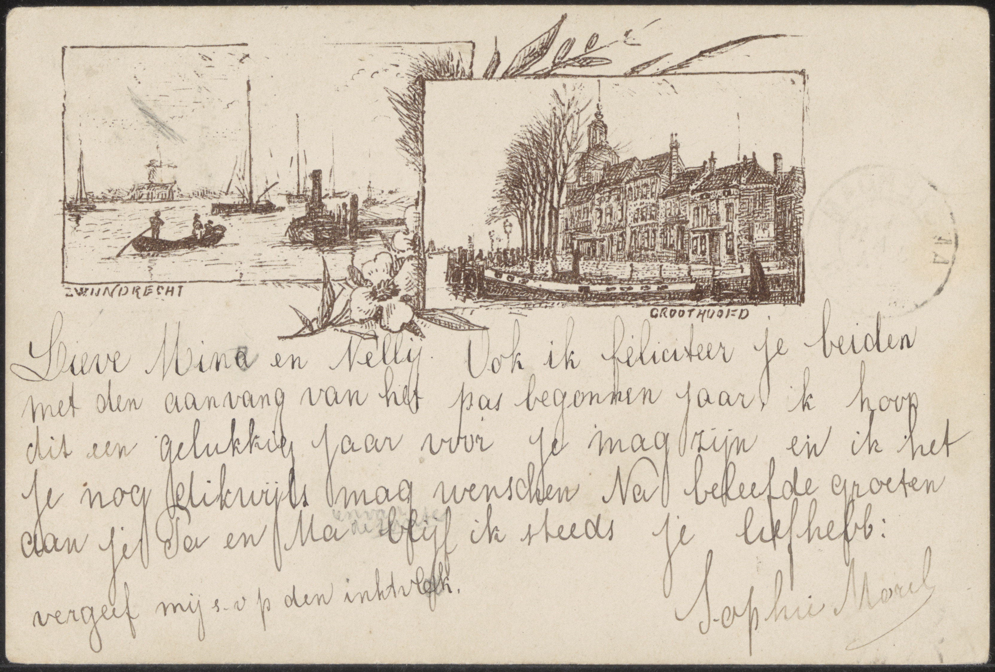 - Tekeningen van de Oude Maas met links molen Welgelegen in Zwijndrecht en rechts het Groothoofd.
