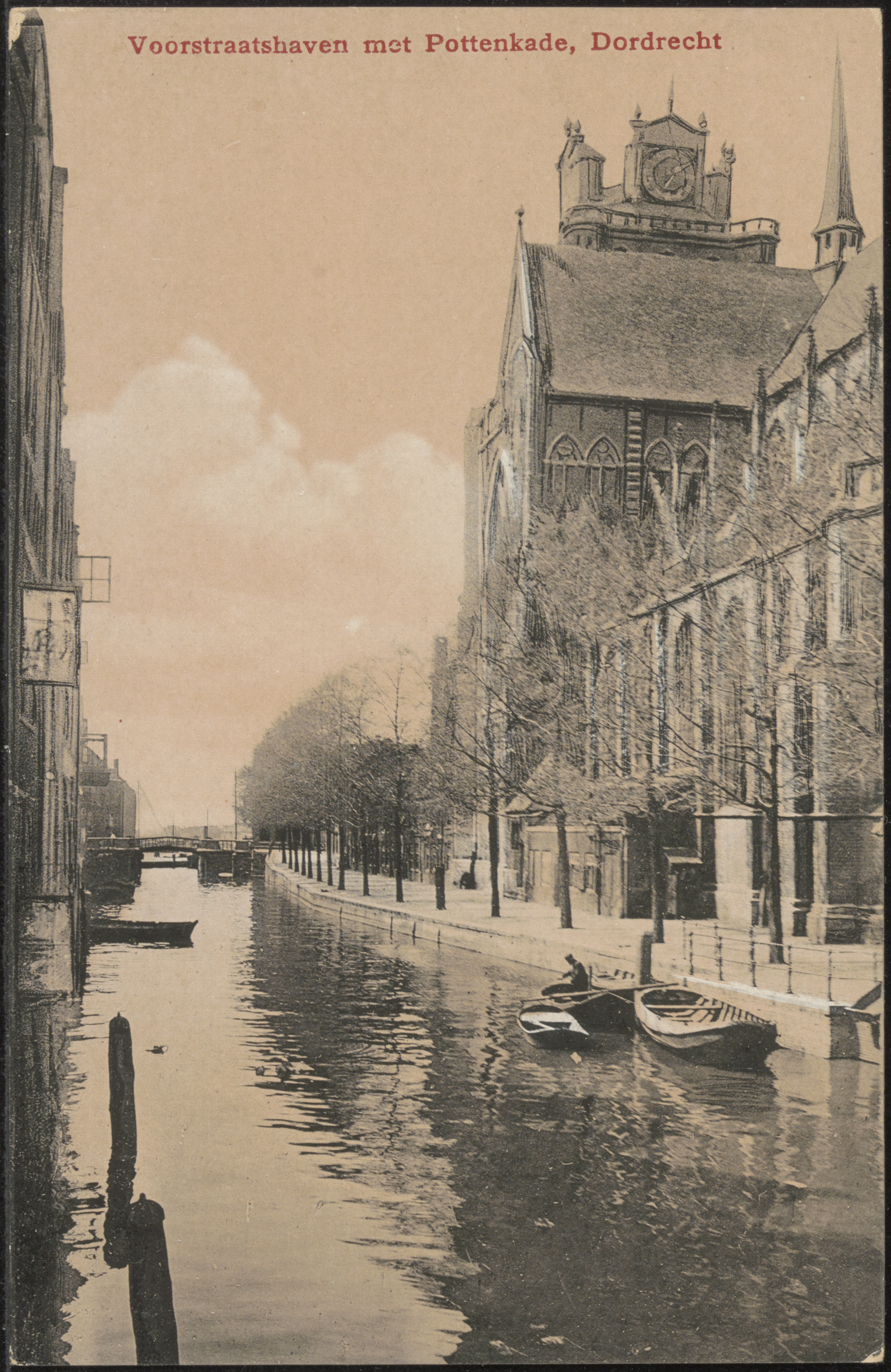 - De Voorstraatshaven tussen Voorstraat (links) en Pottenkade richting Leuvebrug. Tegen de Grote Kerk staat het Korenmetershuisje