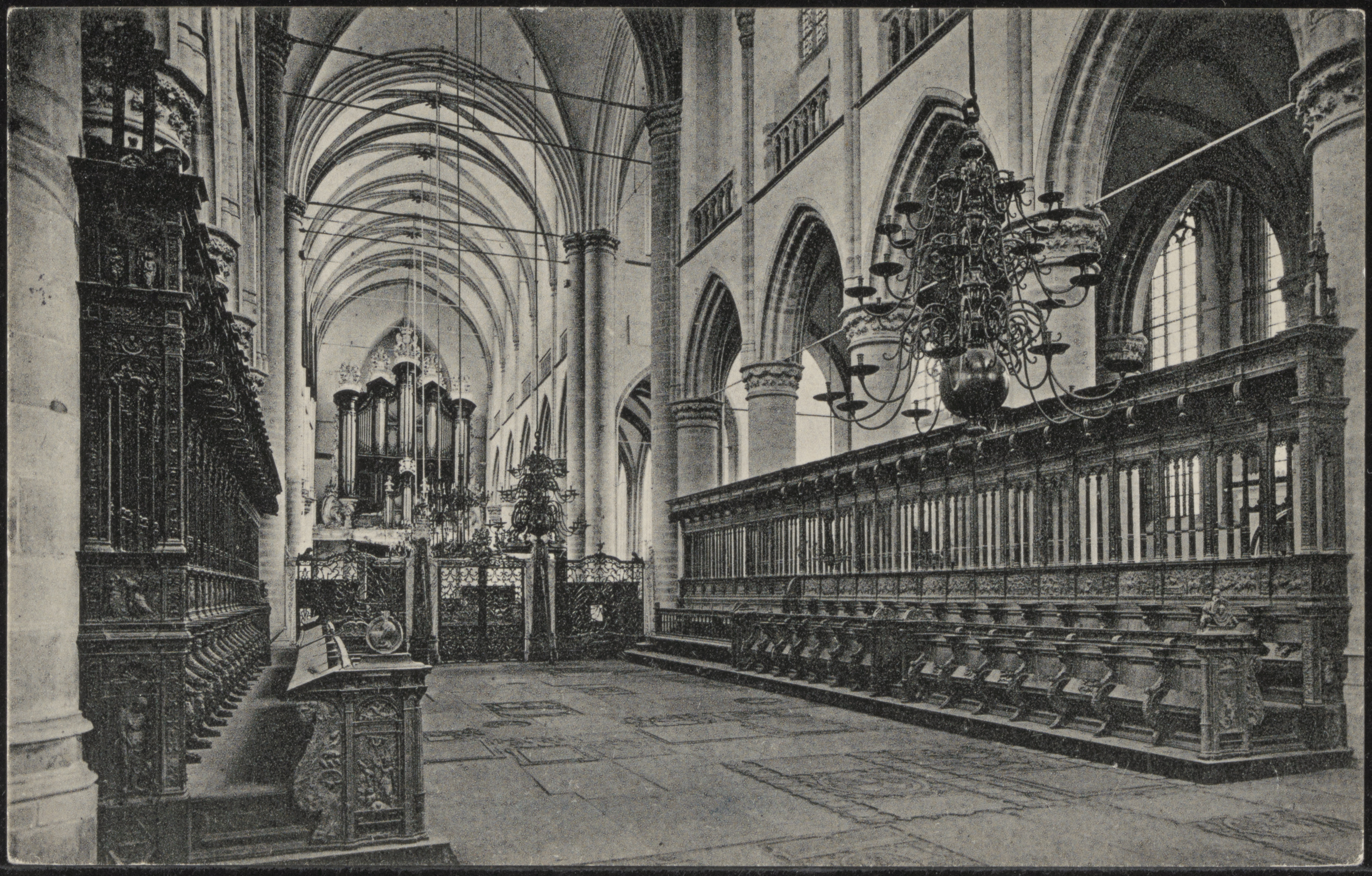 Interieur van de Grote kerk met links en rechts koorbanken en het Kamorgel op de achtergrond.