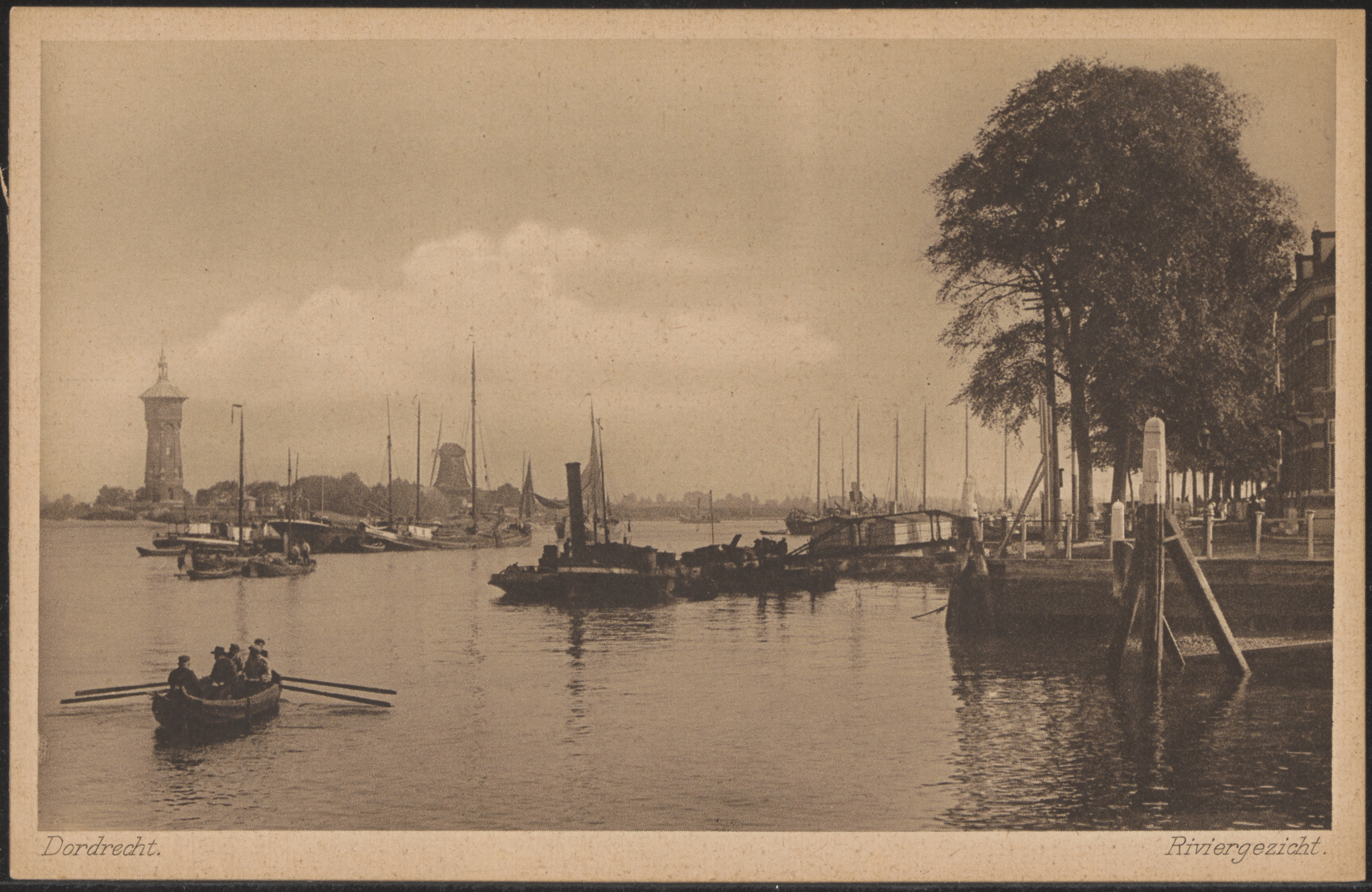 - De Oude Maas vanaf de monding van de Nieuwe Haven. Links de watertoren en molen Welgelegen in Zwijndrecht, rechts de Buiten Walevest.