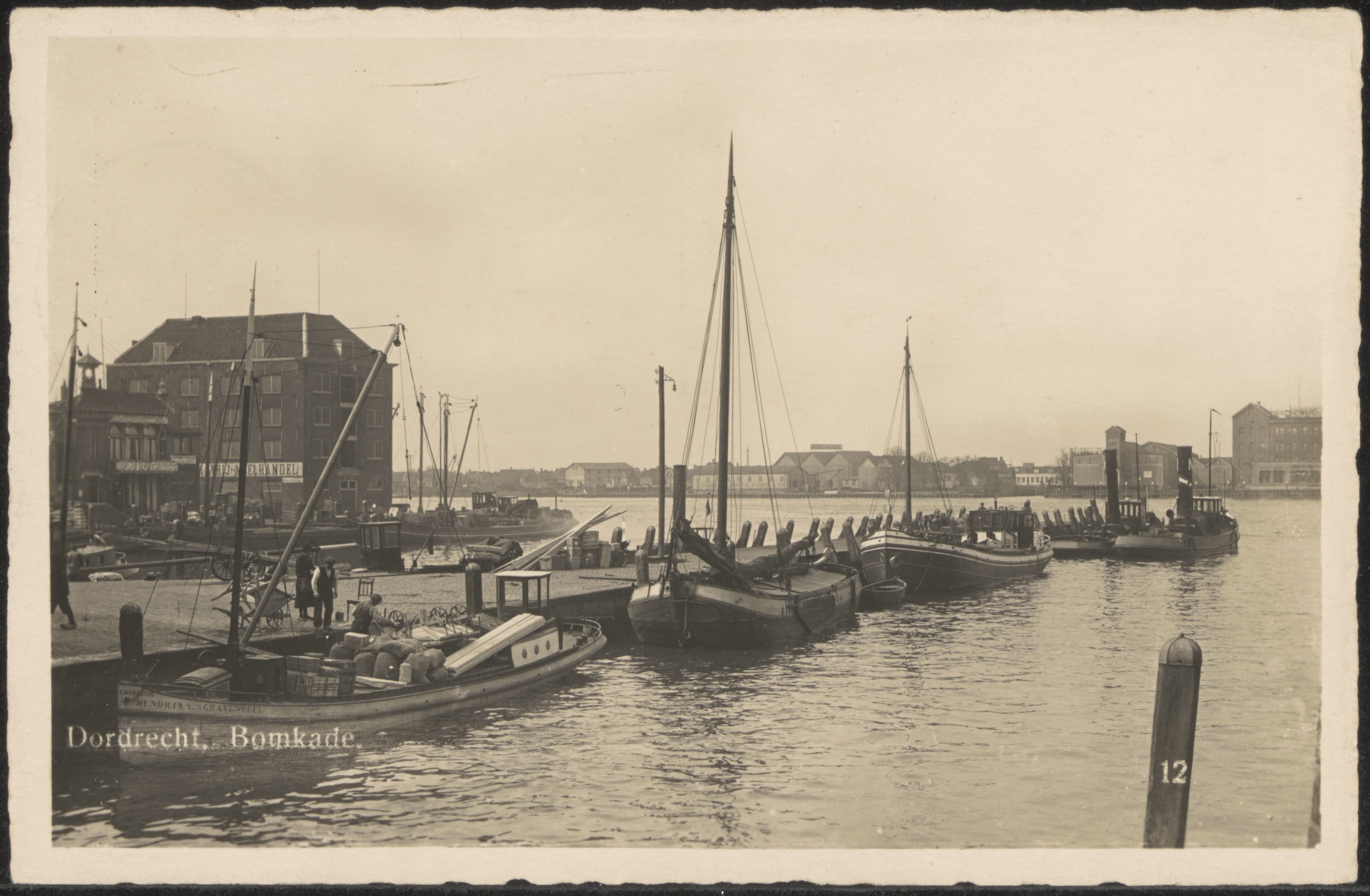 - Bomhaven. Links meelhandel De Vrij in pakhuis Vredenburg op de hoek van de Bomkade en de Buiten Kalkhaven. Op de achtergrond rijstpellerij Howard in Zwijndrecht.
