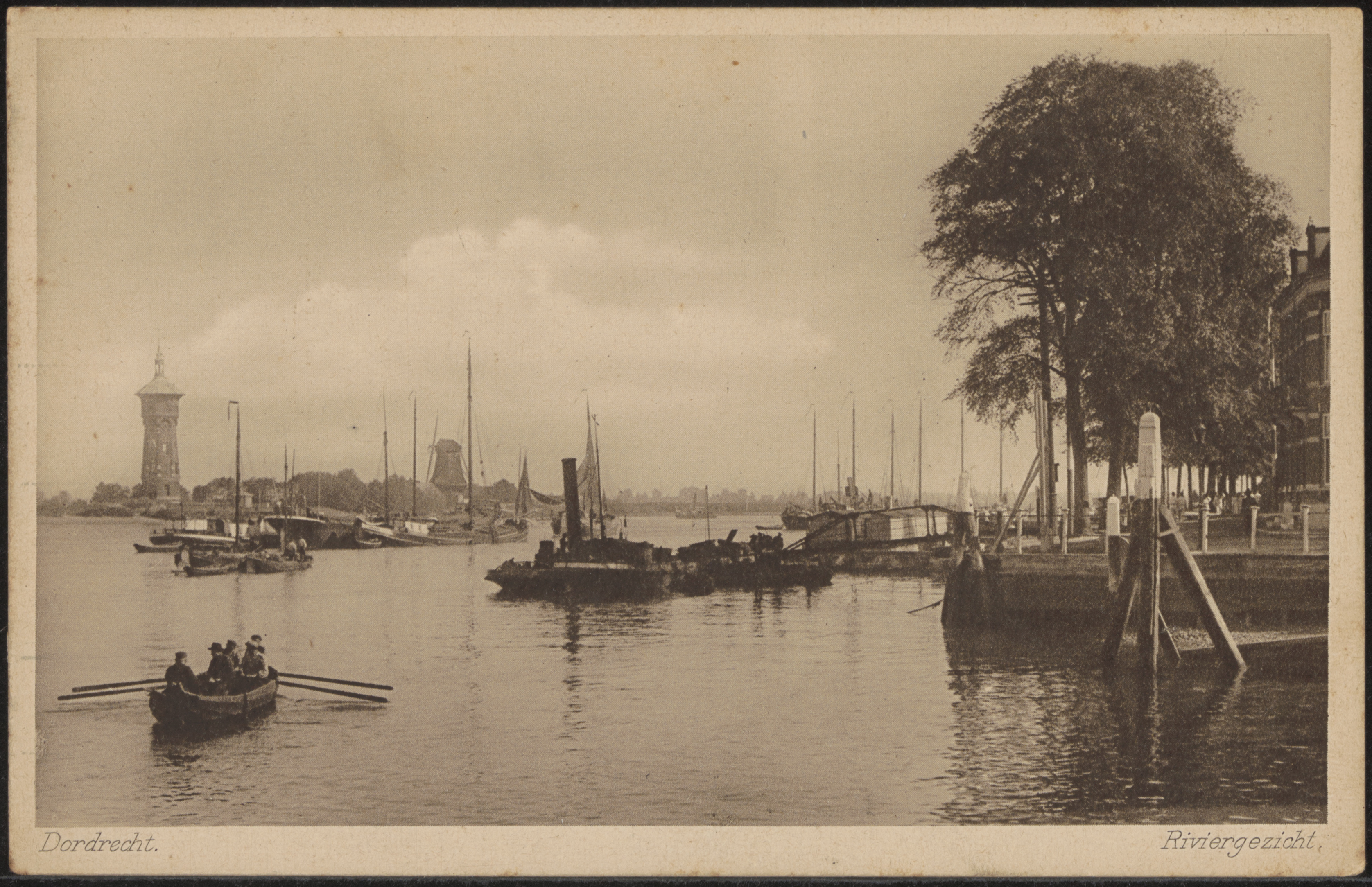 - De Oude Maas vanaf de monding van de Nieuwe Haven. Op de achtergrond de watertoren en molen Welgelegen in Zwijndrecht. Rechts het zwembad aan de Buiten Walevest.