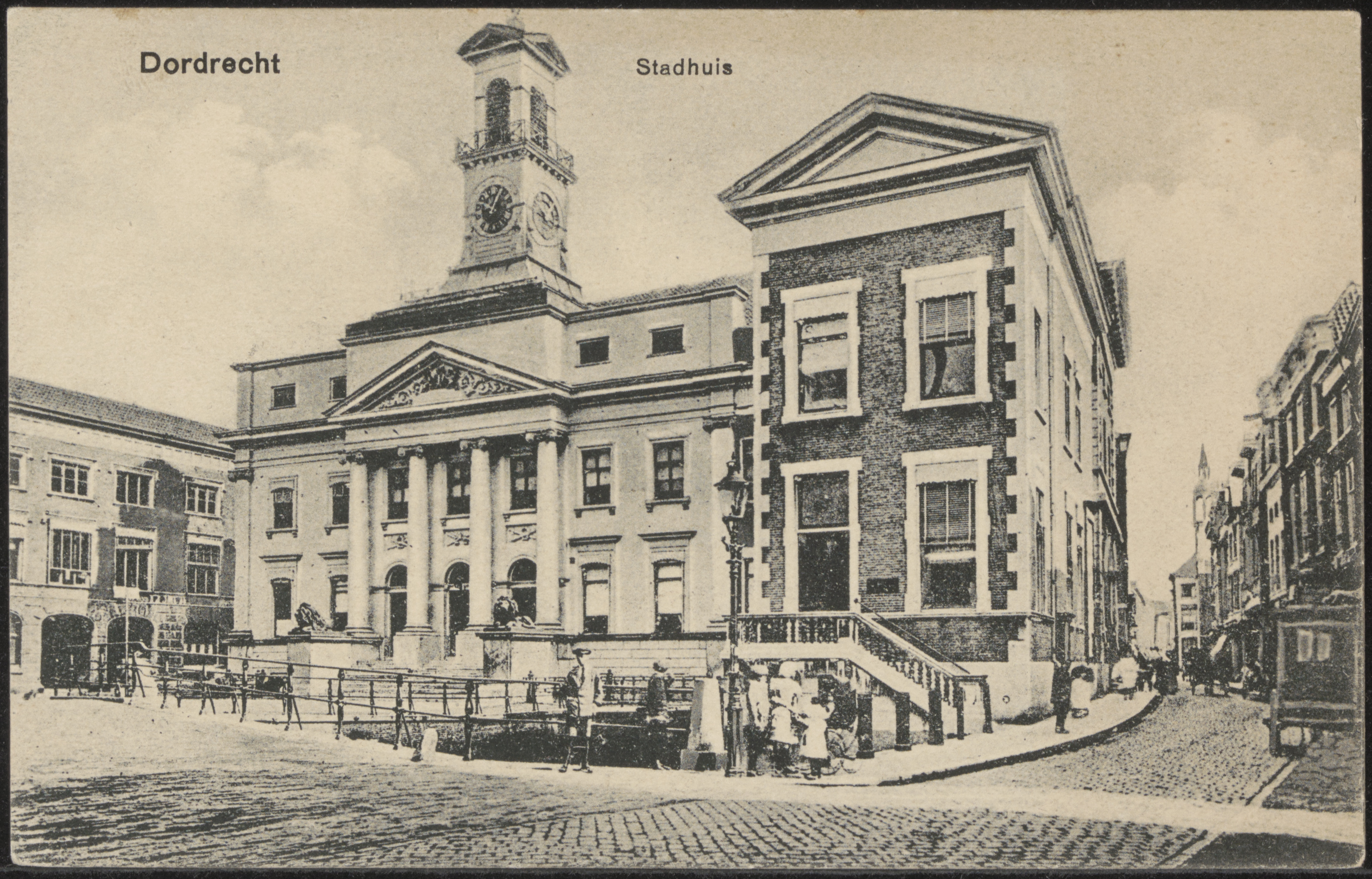 - Het stadhuis aan het Stadhuisplein. Links de Lombardbrug en het politiebureau aan de Groenmarkt er achter. Rechts de Voorstraat.