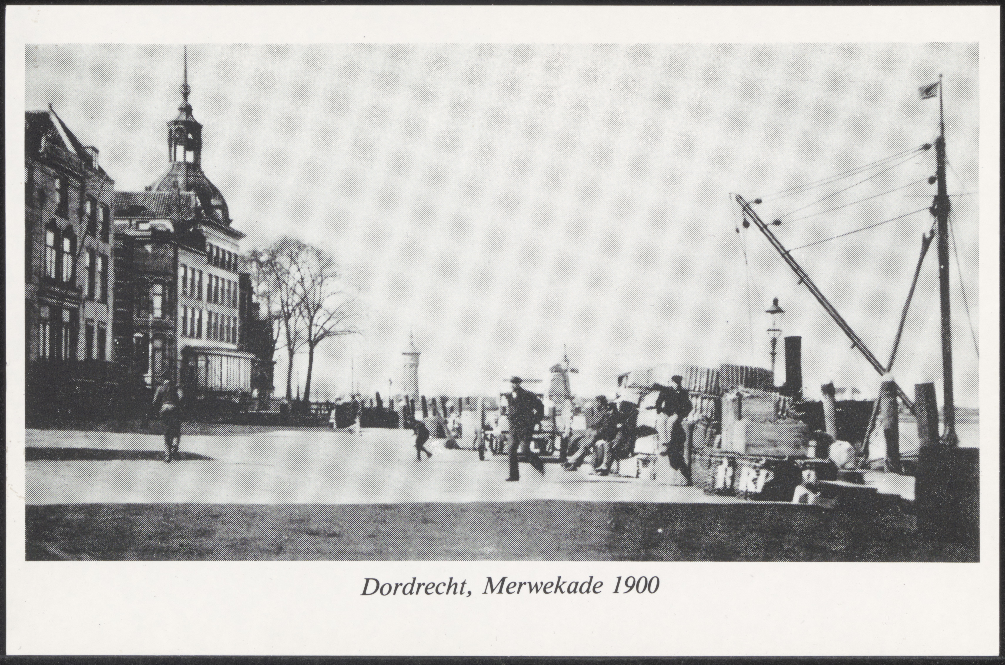 - Merwekade richting Hotel Bellevue en de Groothoofdspoort op het Groothoofd. Op de achtergrond watertoren en molen Welgelegen in Zwijndrecht.