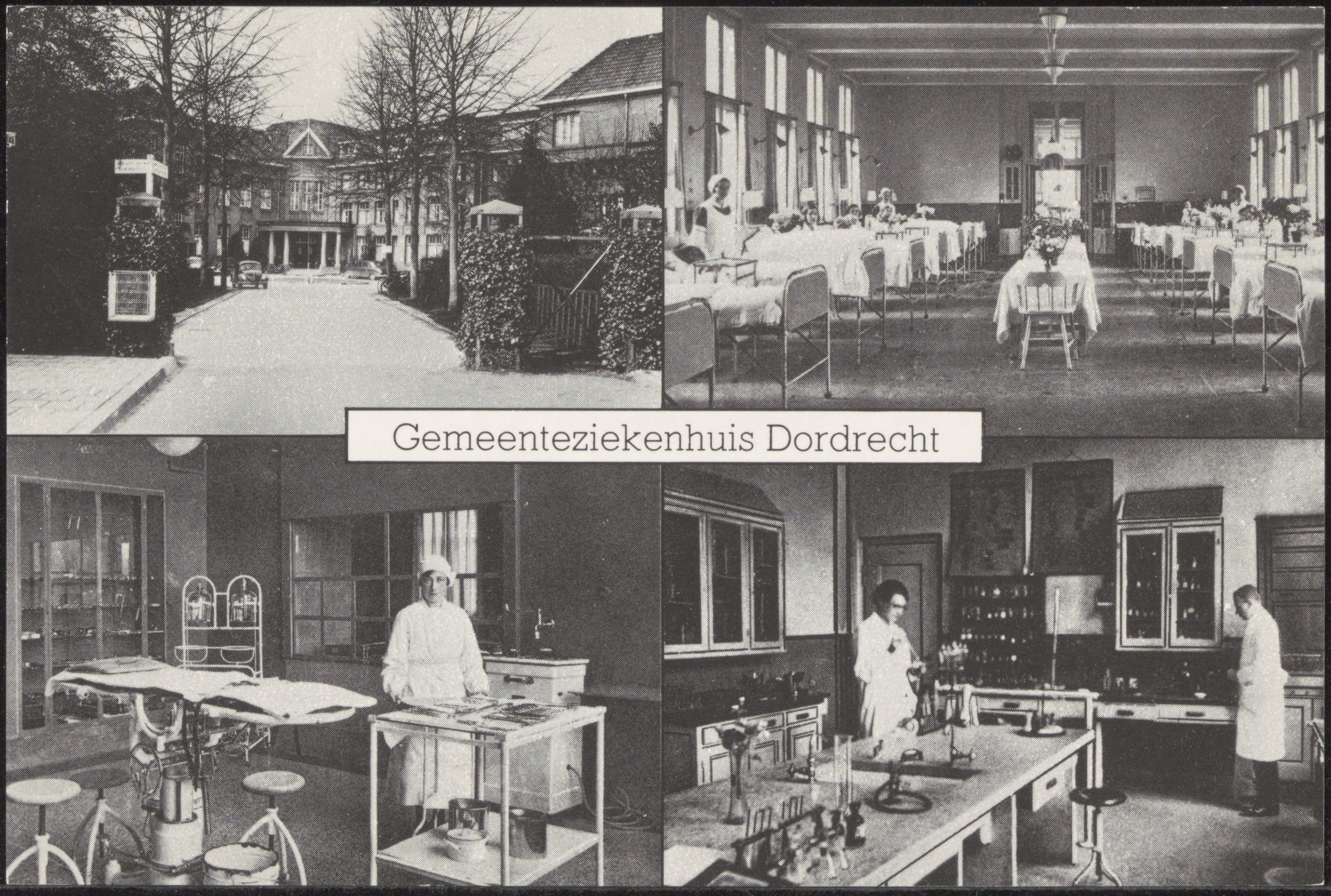 LB: Hoofdingang Bankastraat. RB: Mannenzaal Gemeenteziekenhuis Bankastraat. LO: Operatiekamer Gasthuis? RO: Laboratorium van Gemeenteziekenhuis Bankastraat.