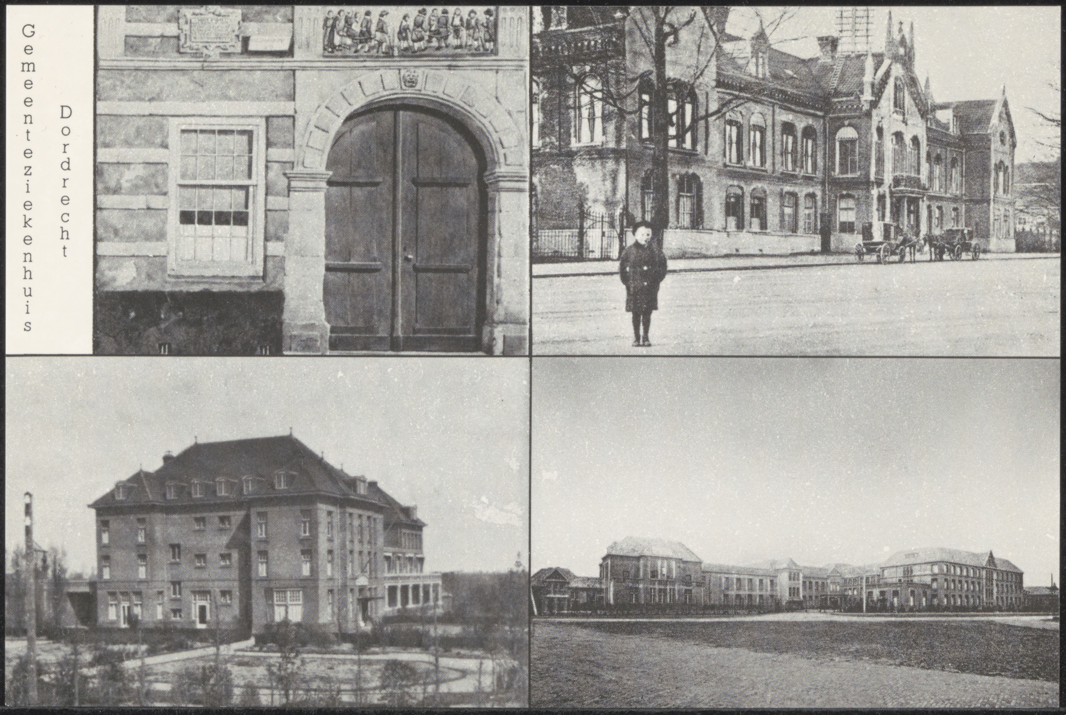 Rechtsboven: Gasthuis Beverwijcksplein. Linksonder: Ziekenverpleging Ceramstraat. Rechtsonder: Gemeenteziekenhuis Bankastraat.