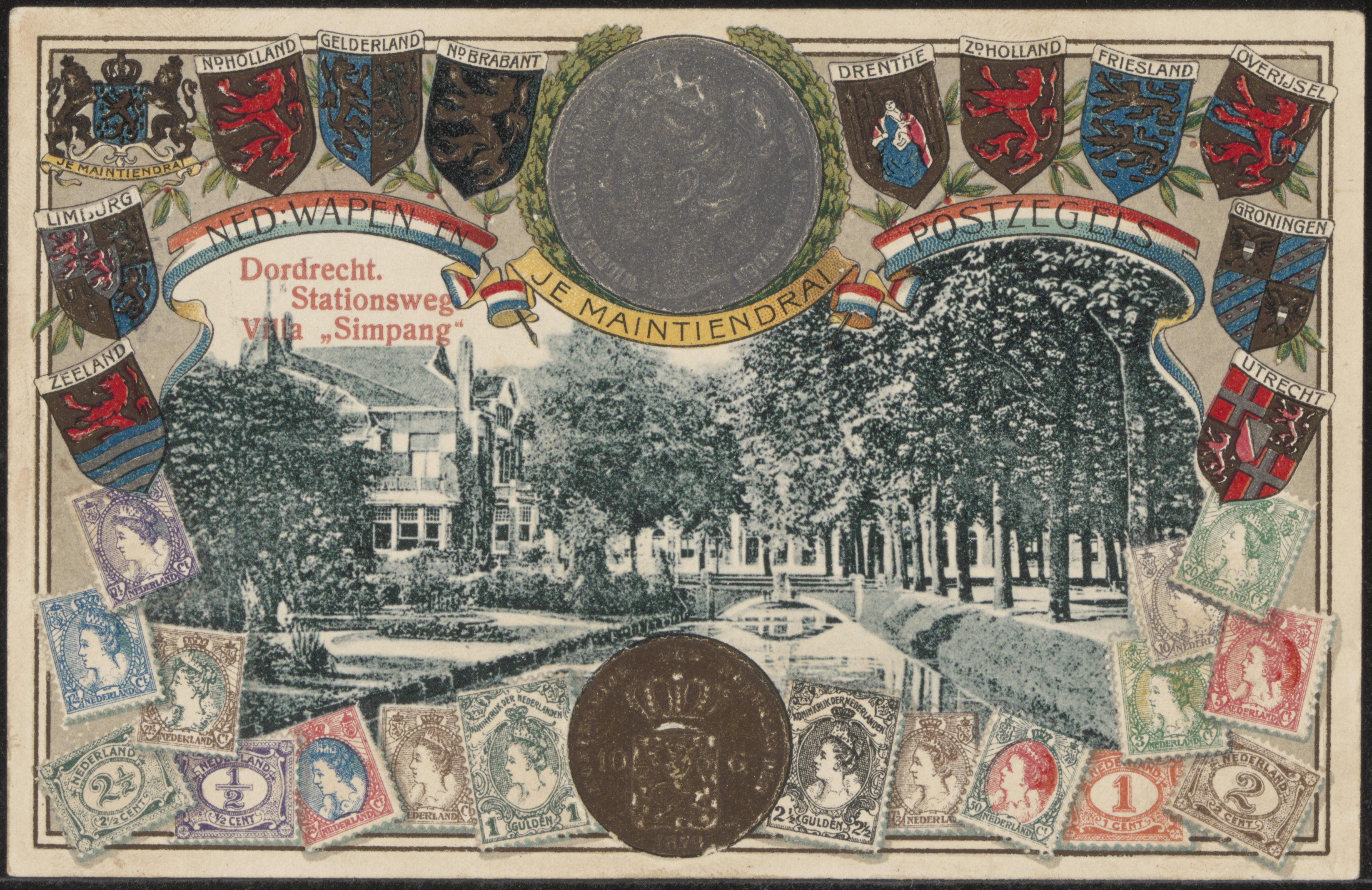 Prentbriefkaart met wapens van de provincie's en postzegels van Nederland.