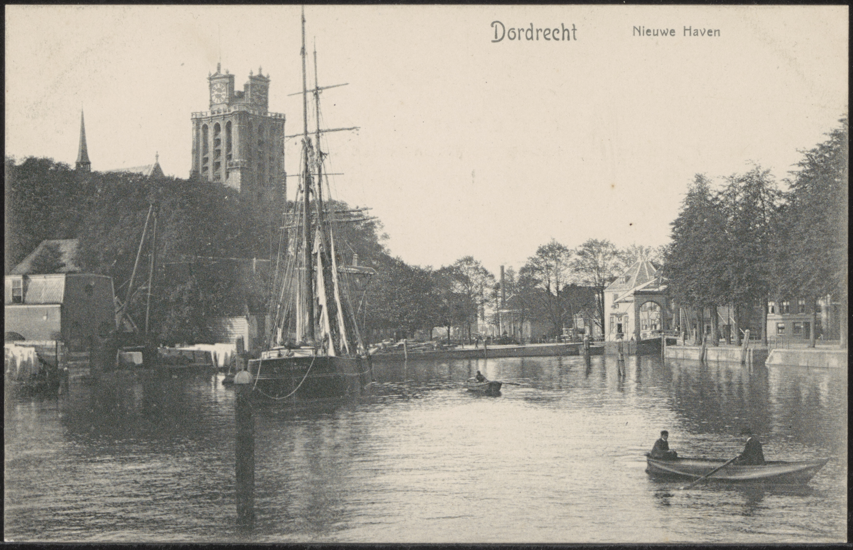 Nieuwe Haven vanaf de Aardappelmarkt richting Grote Kerk. Links de Knolhaven, rechts de …