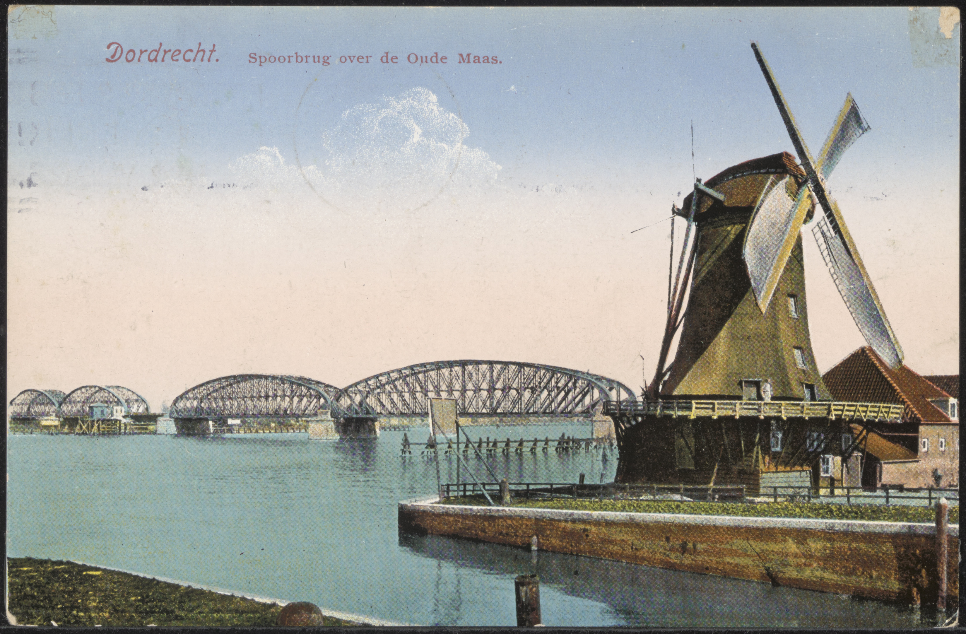 - Molen De Zeelt aan de 's-Gravendeelsedijk en de spoorbrug naar Zwijndrecht over de Oude Maas.