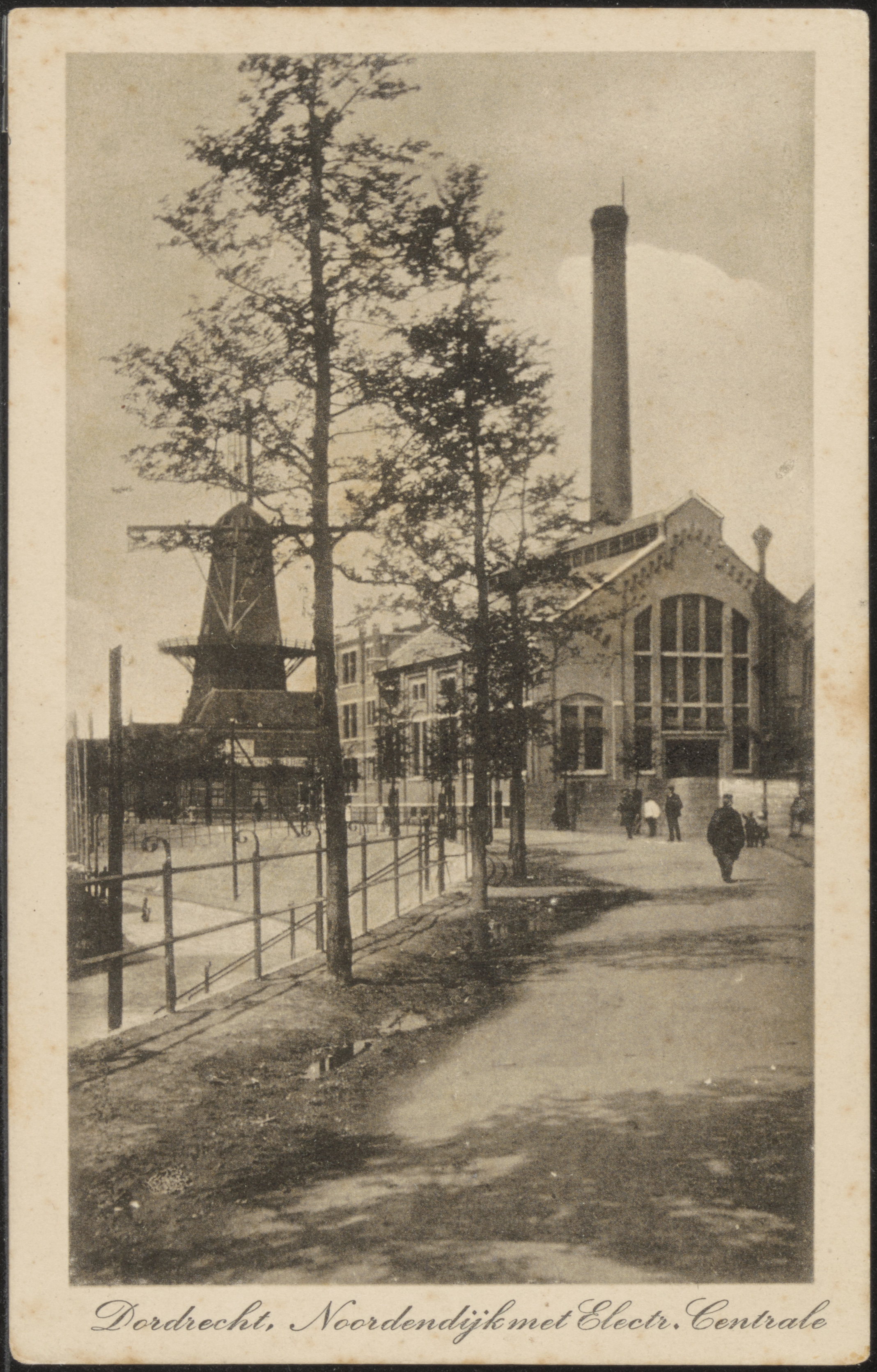 De elektriciteitscentrale en molen Kijck over den Dijck aan de Noordendijk.