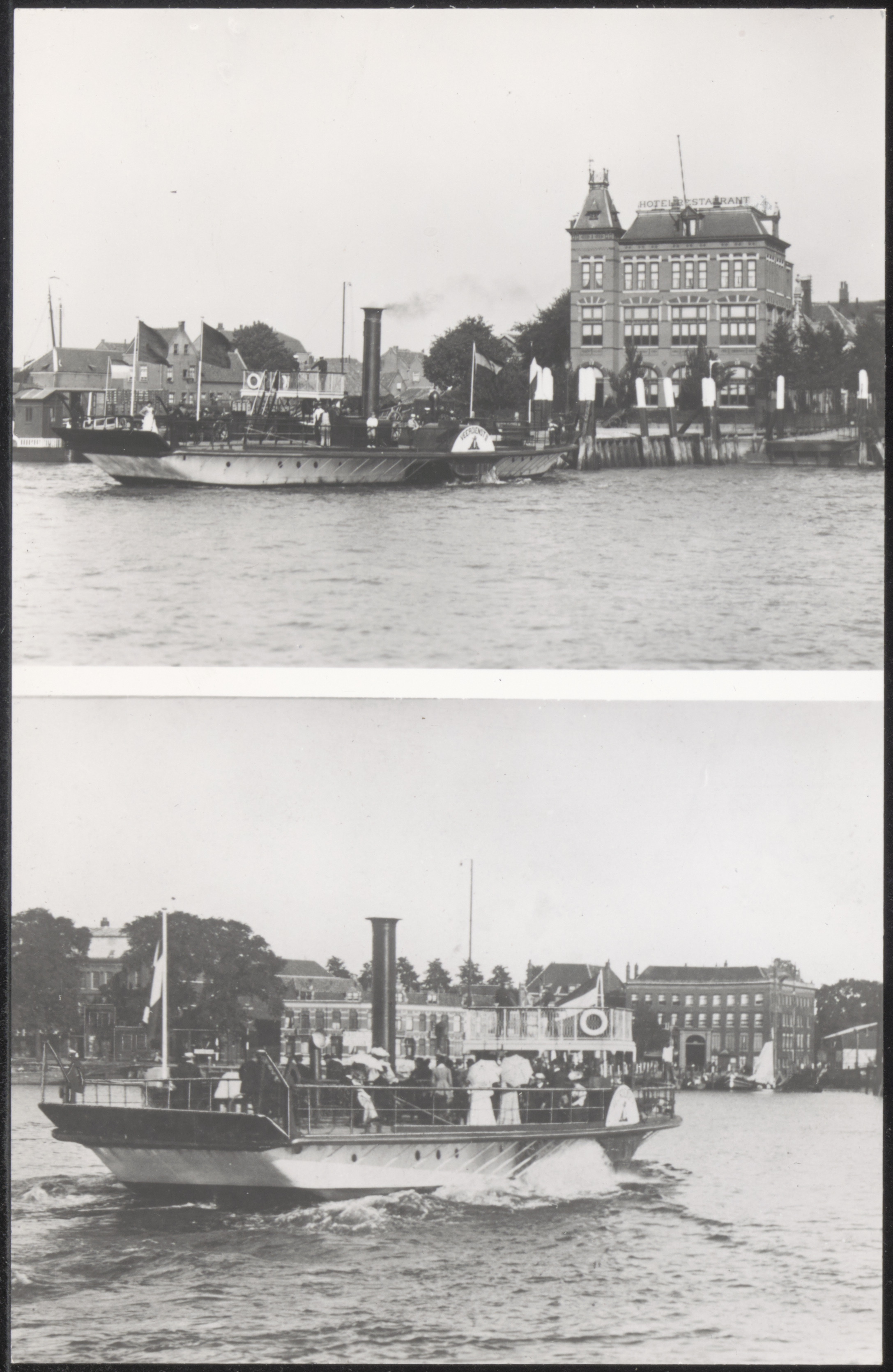 - Boven: Stoomraderboot Veerdienst II bij Zwijndrecht nabij Hotel Het Witte Paard. Onder: Stoomraderboot Veerdienst II onderweg naar Dordrecht, rechts de Blauwpoort..