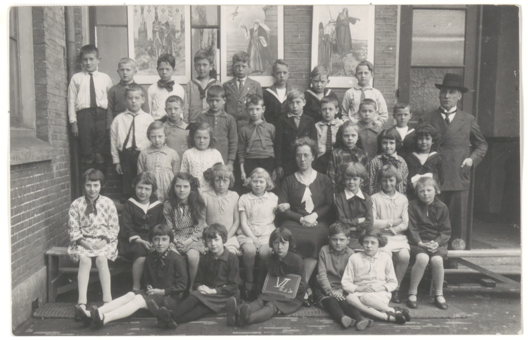 - De klas VI van de Geref. School voor LO en ULO aan de Vrieseweg. Rechts met donkere hoed, het hoofd van de school H.J. Motshagen, poserend op het schoolplein.