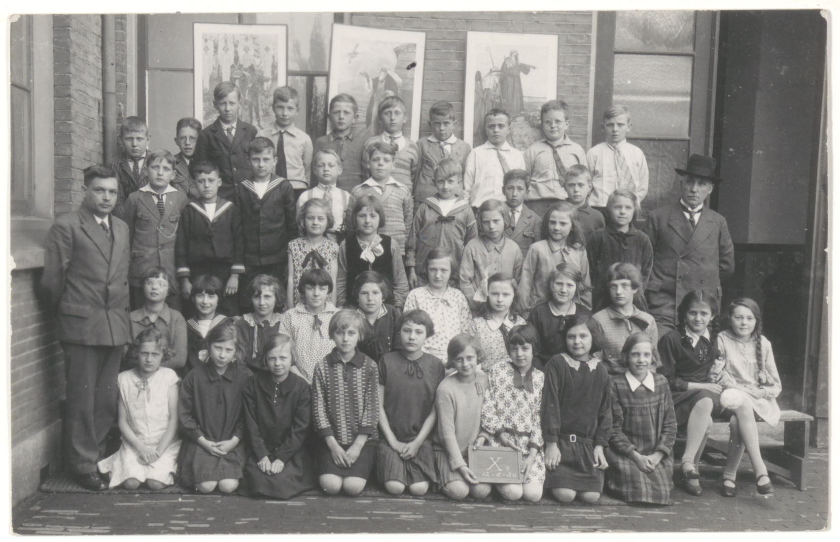 De klas X van de Geref. School voor LO en ULO aan de Vrieseweg. Rechts met donkere …
