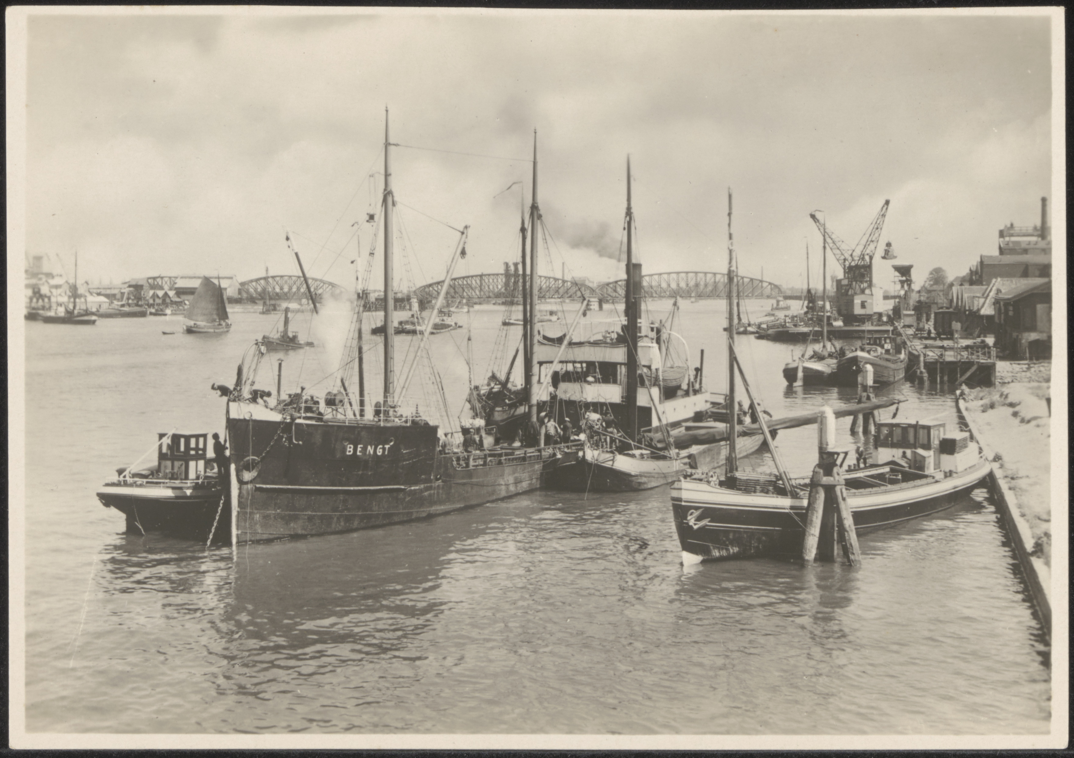 - Schepen op de Oude Maas t.h.v. de Handelskade, de spoorbrug op de achtergrond.