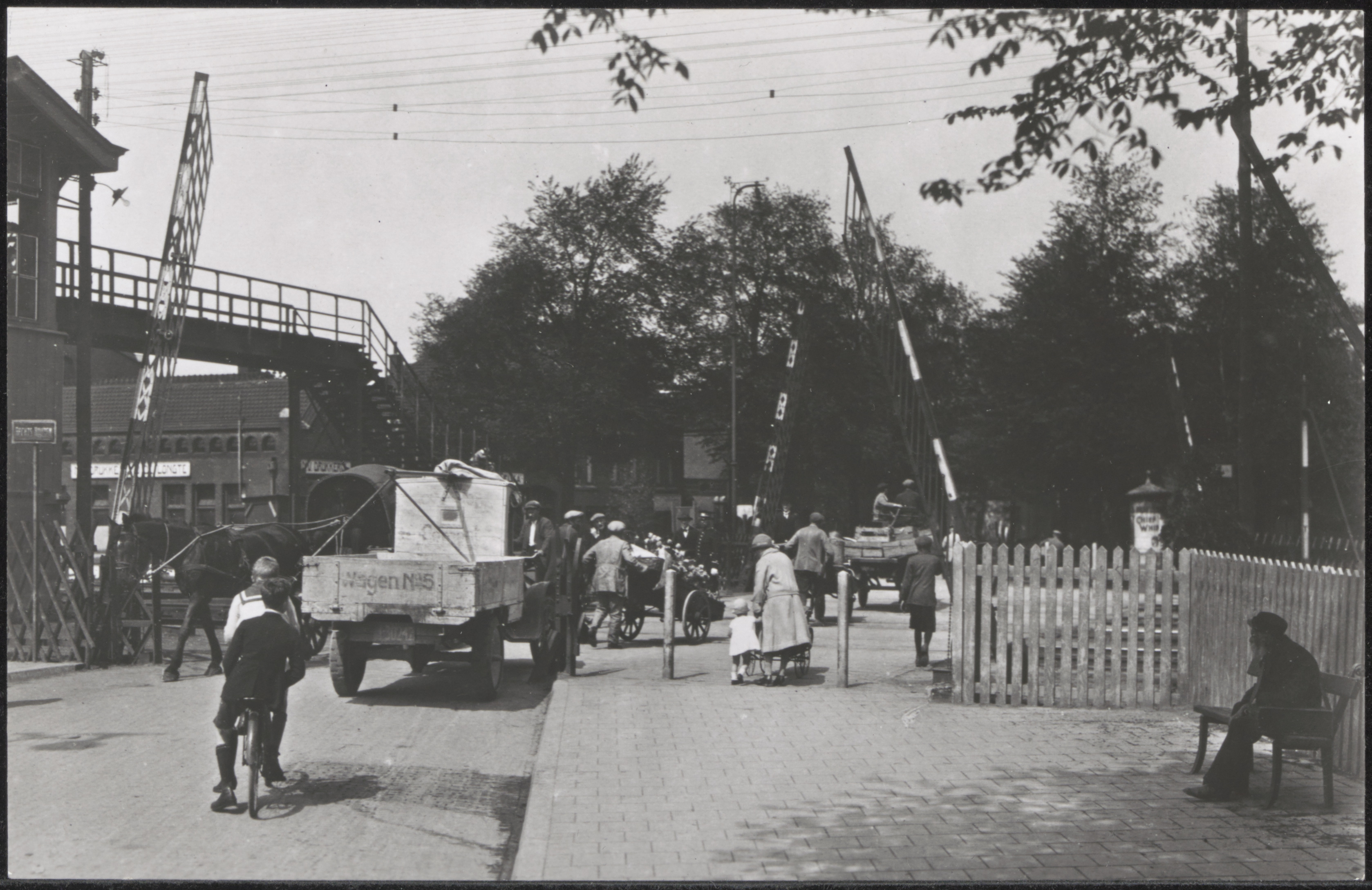 - fietsers handkarren overwegen / spoorwegovergangen paard-en-wagens voetgangers voetgangersbruggen vrachtwagens zitbanken