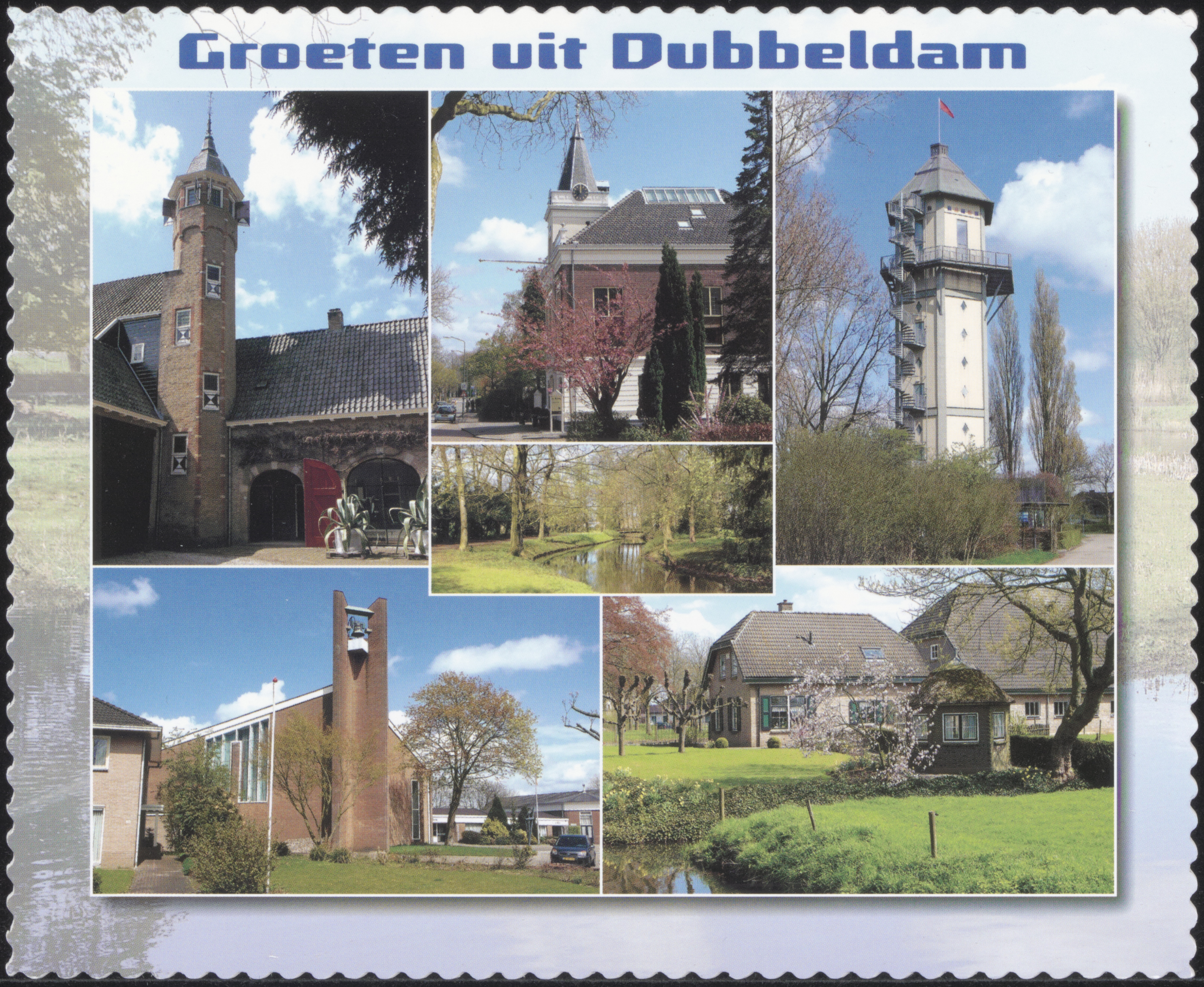 - 1. Hofstede op landgoed Dordwijck aan de Dordwijklaan. 2. Gemeentehuis van Dubbeldam aan de Dubbelsteynlaan West. 3. Watertoren op de hoek Kromme Zandweg - Haaswijkweg Oost. Midden: Dubbelsteynpark aan de Dubbelsteynlaan West. 4. Hervormde kerk De Wijnstok aan de Dubbelsteynlaan West. 5. Boerderij Merwezicht aan de Kromme Zandweg.