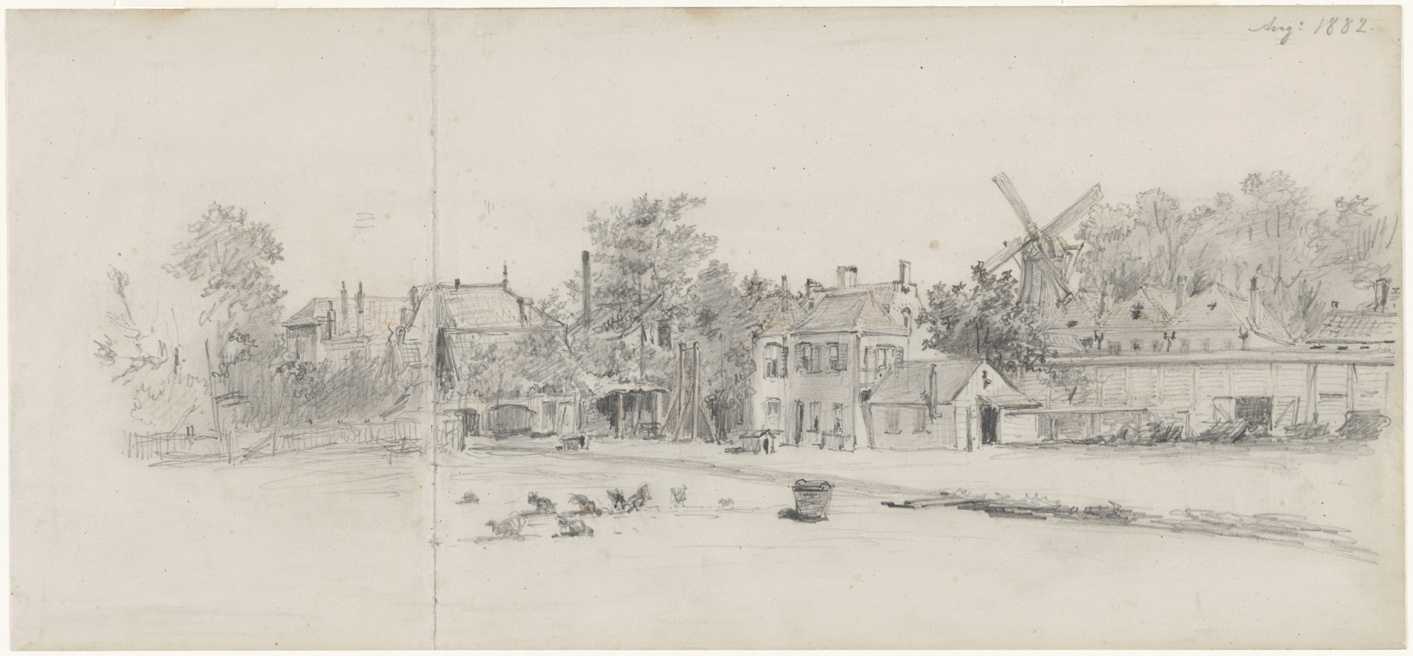 - Tekening van de bebouwing ter hoogte van het huidige kruispunt Vrieseweg - Kromhout, met op de achtergrond de De Zwarte Arend.