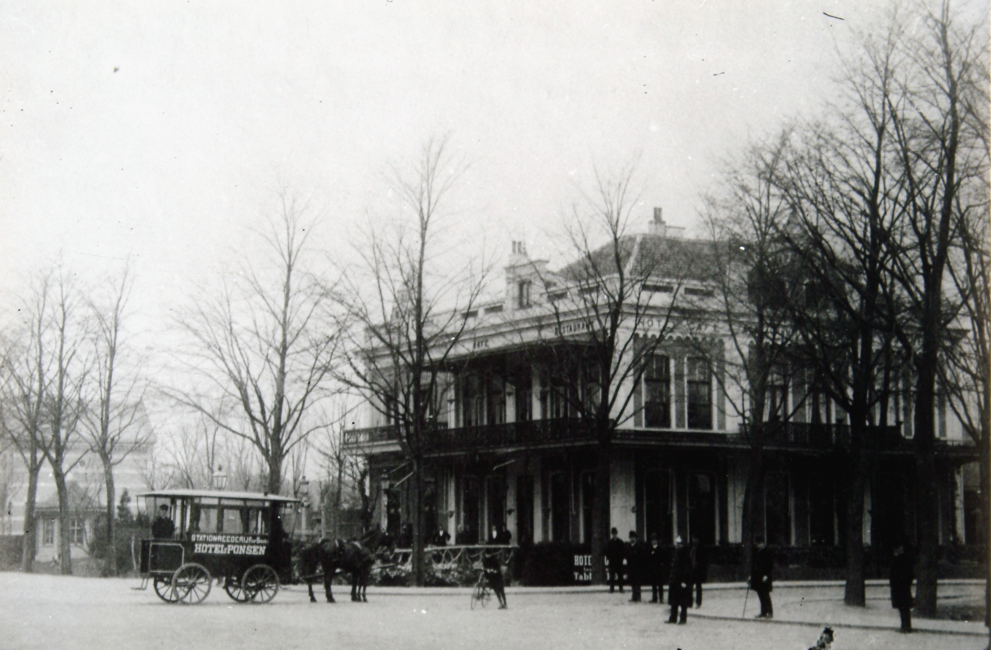 - Stationsweg (rechts) met Hotel Ponsen op de hoek van de Burgemeester de Raadtsingel. Een paardentramdienst van de heer W.J. Ponsen die in 1891 begon, werd na korte tijd weer gestaakt.