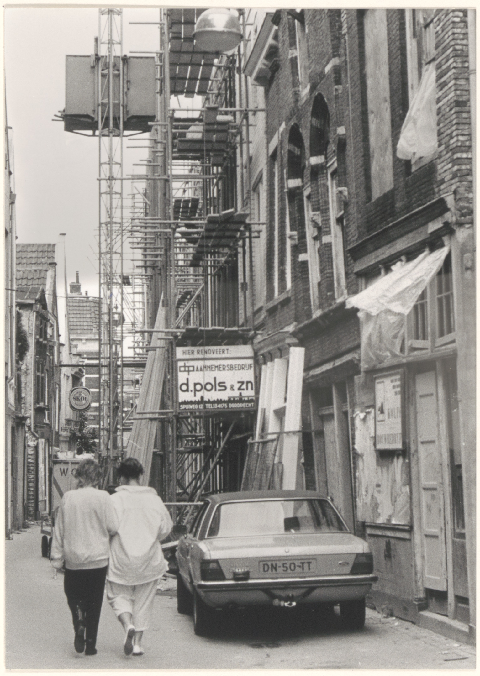 - Noordoostzijde van de Vleeshouwersstraat met steigers en liftje t.b.v. de restauratie van enkele panden; gezien naar de Nieuwe Haven.