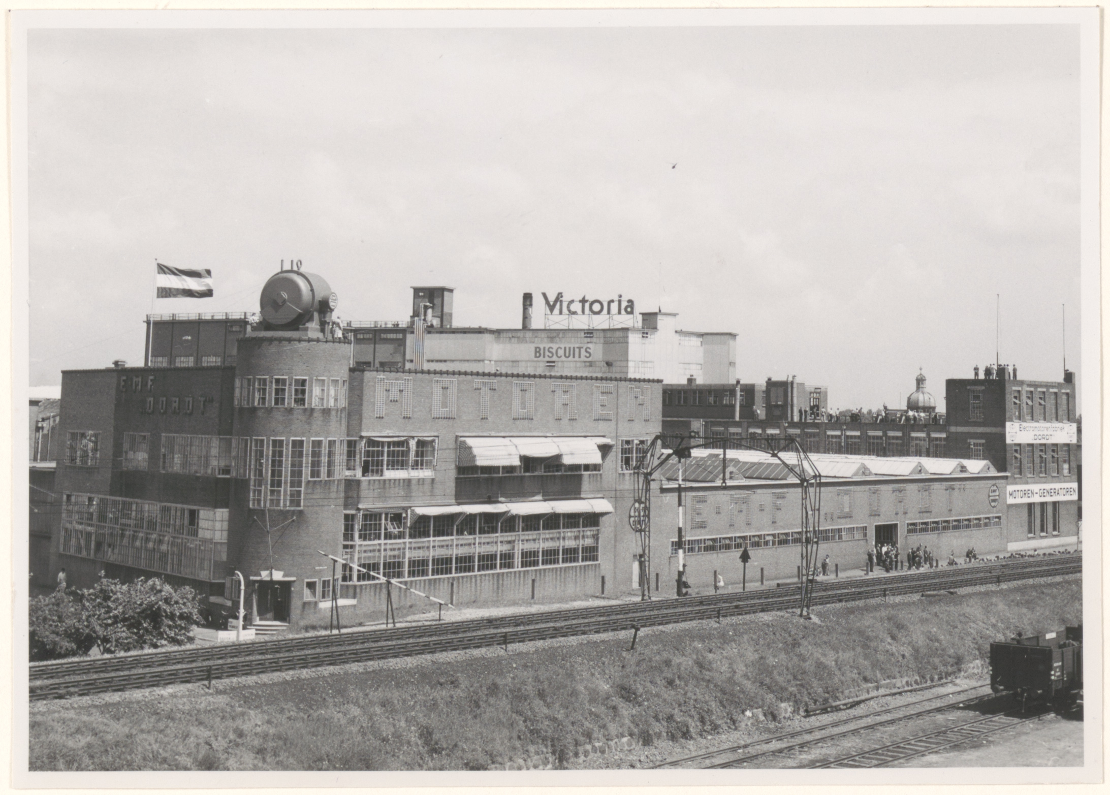 - De elektromotorenfabriek EMF Dordt aan de Korte Parallelweg, hoek Wilgenbos (links). De vlag hangt uit, op het gebouw rechts is men bezig er nog een te hijsen; beneden verzamelt zich een rij personeelsleden; mogelijk betreft het de viering van een jubileum, waarschijnlijk in 1961. Op de achtergrond de Victoria-fabriek.