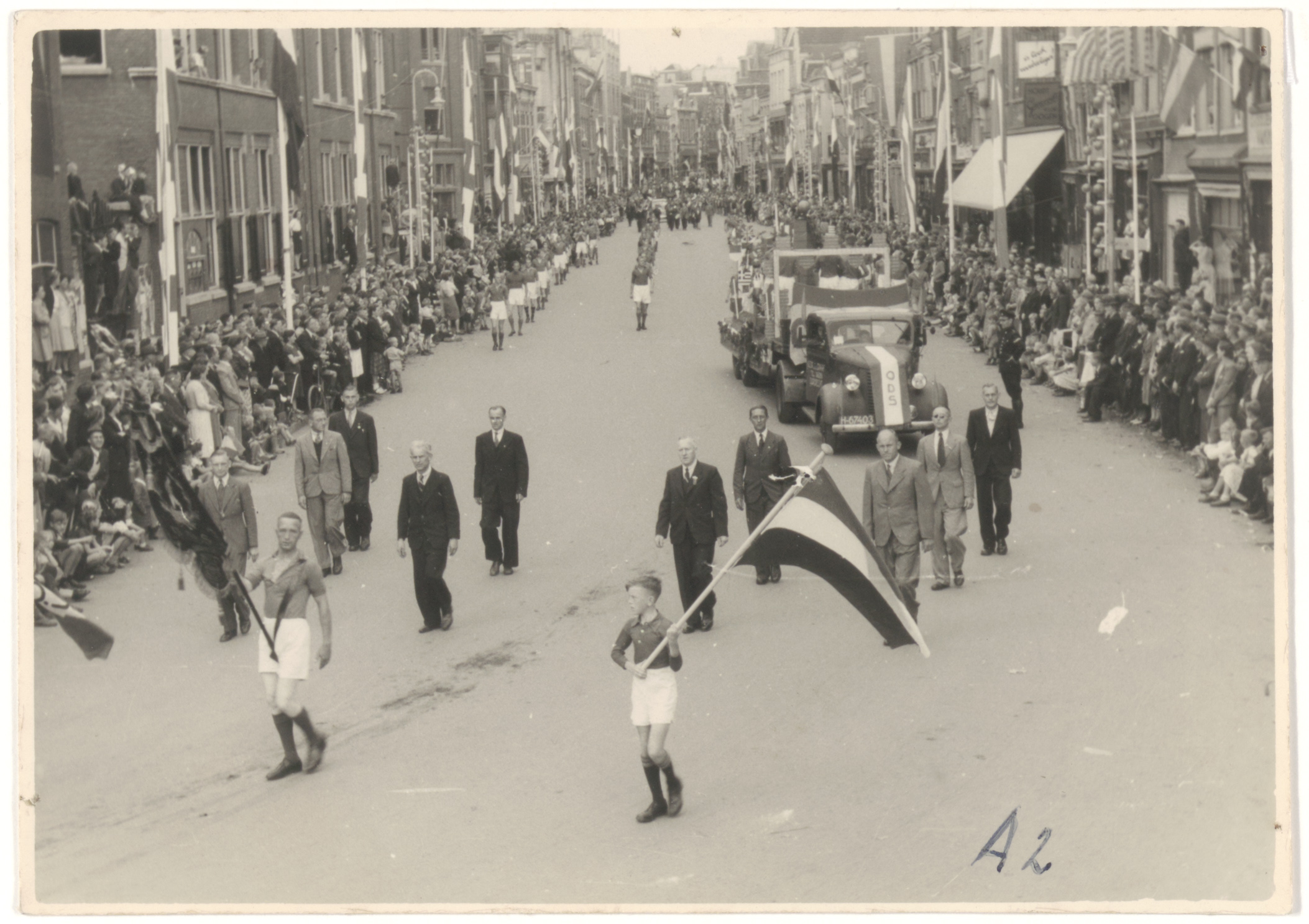 bevrijding optochten postkantoren praalwagens publiek / toeschouwers vaandels vlaggen(stokken) voetbal (clubs, spelers, wedstrijden)