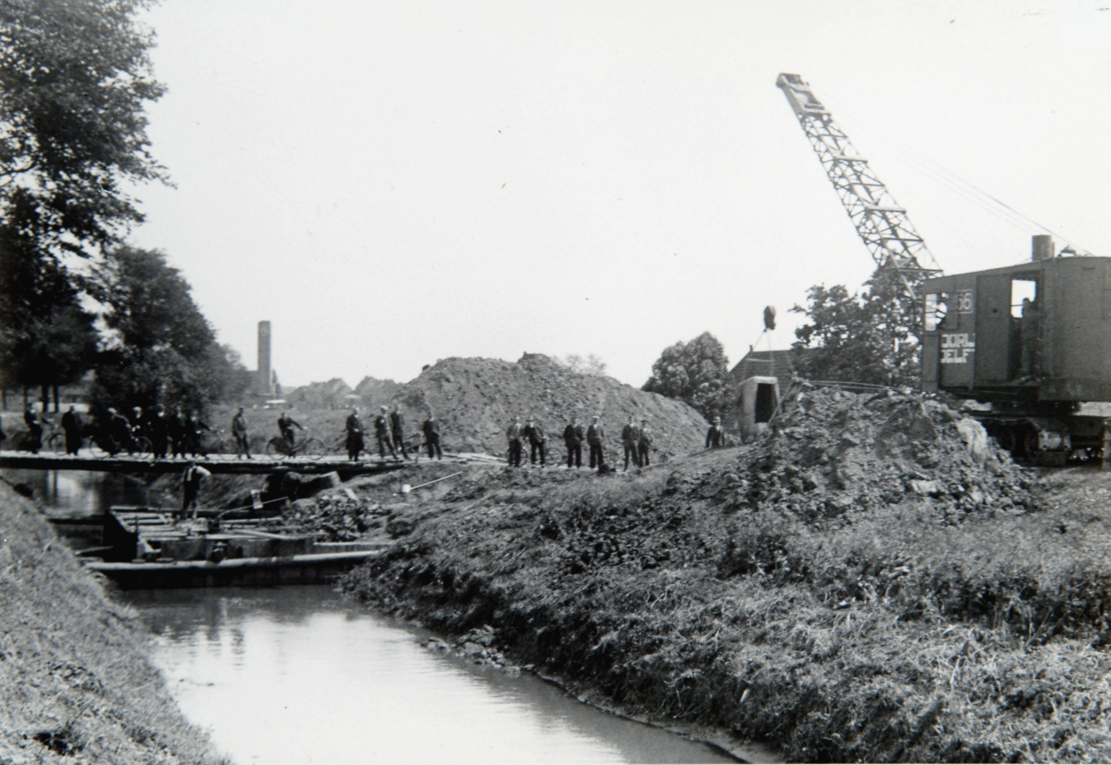 Rioleringswerkzaamheden door de Vuile Vliet en de Brouwersdijk. Op de achtergrond is de toren van de Torenschool te zien.
