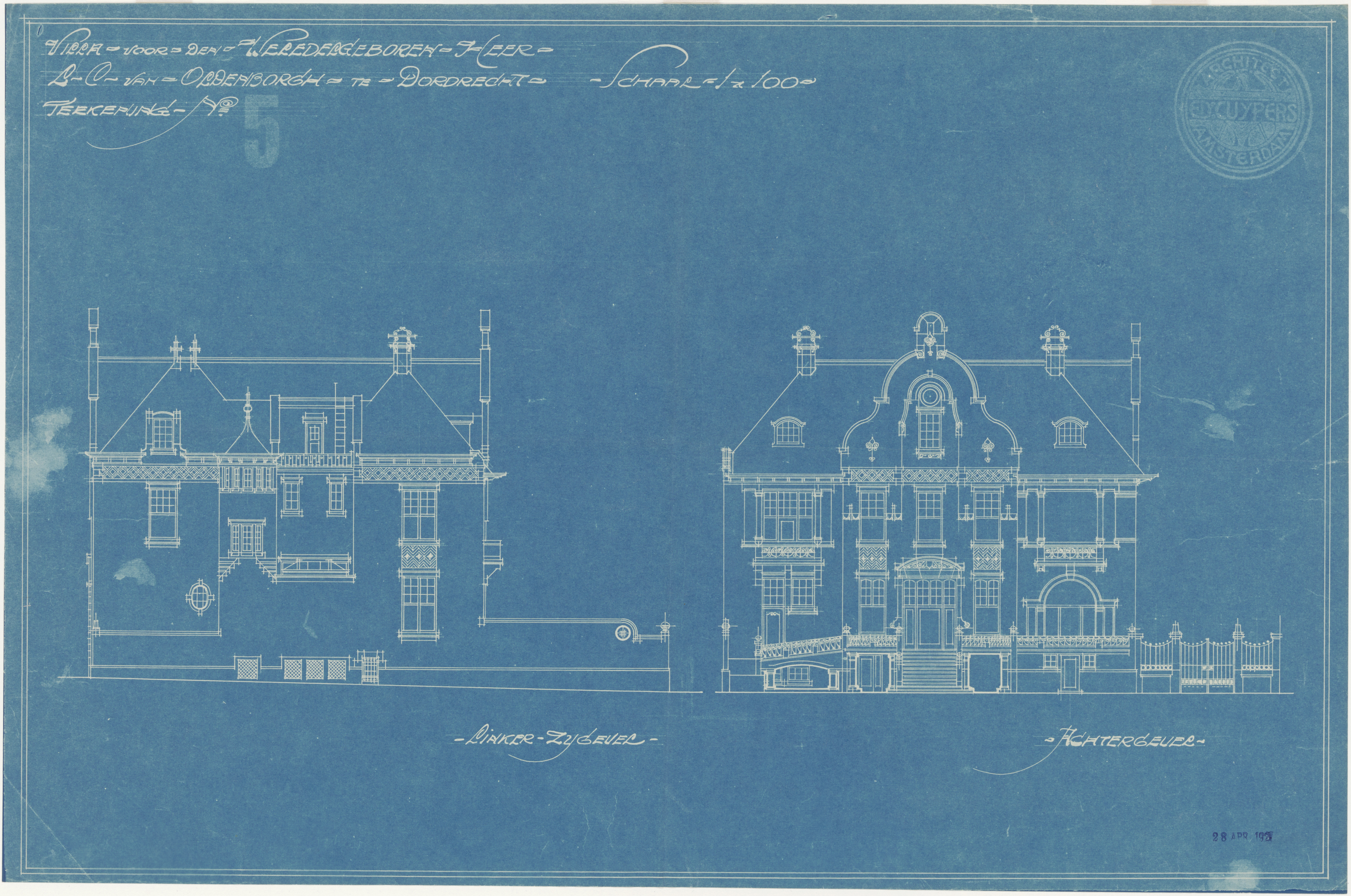 - Bouwkundige tekening van een woonhuis aan de zuidzijde van de Albert Cuypsingel tegenover de Johan de Wittstraat.