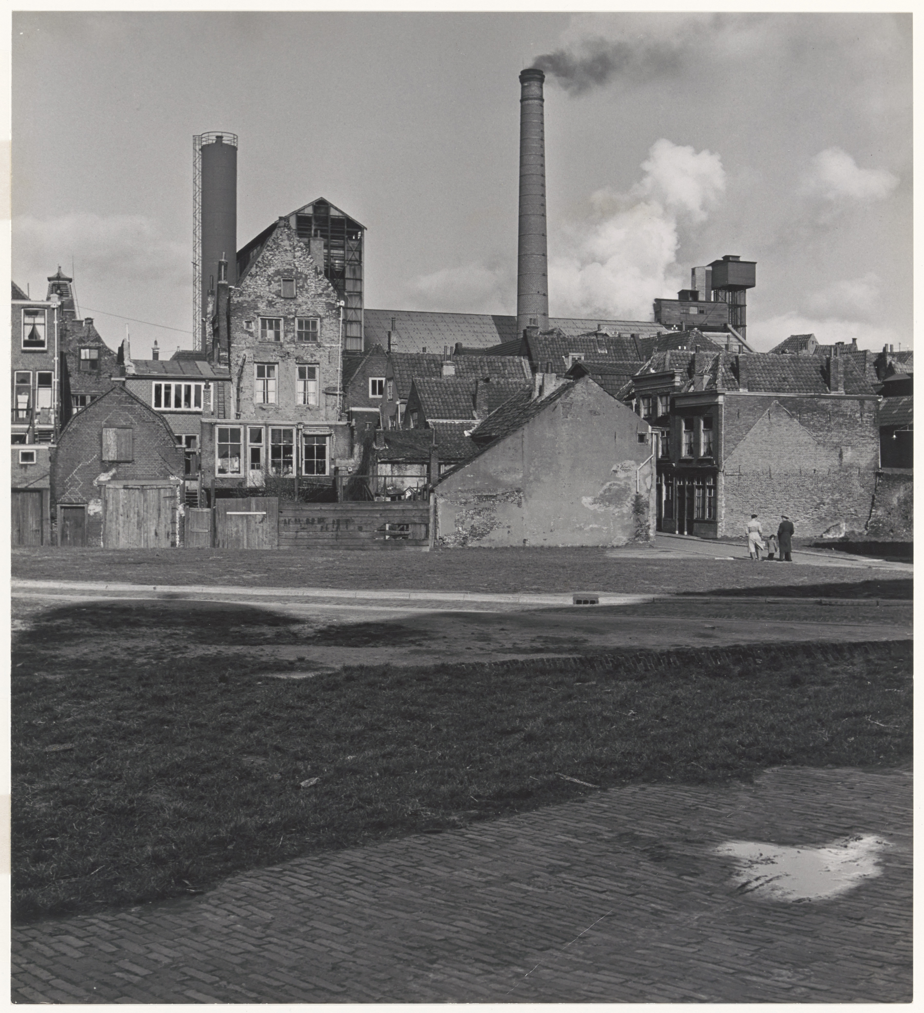 - De achterzijden van de huizen aan de zuidzijde van de Riedijk, gezien vanuit de Torenstraat. De schoorstenen zijn van de gasfabriek.