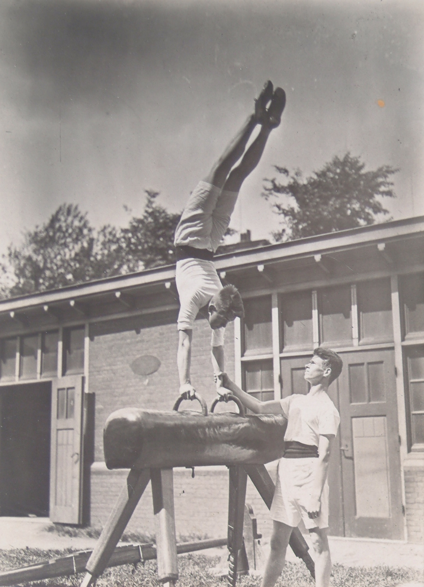 Leerlingen van de HBS aan het Oranjepark doen gymnastische oefeningen