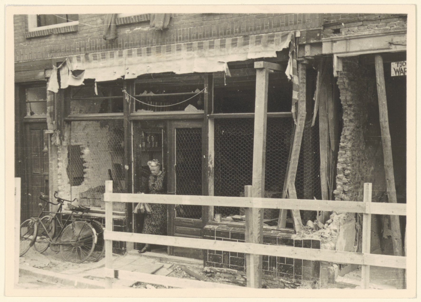 - De in de meidagen van 1940 beschadigde groentewinkel van Mol in de Vriesestraat; in de deuropening mevrouw Mol.
