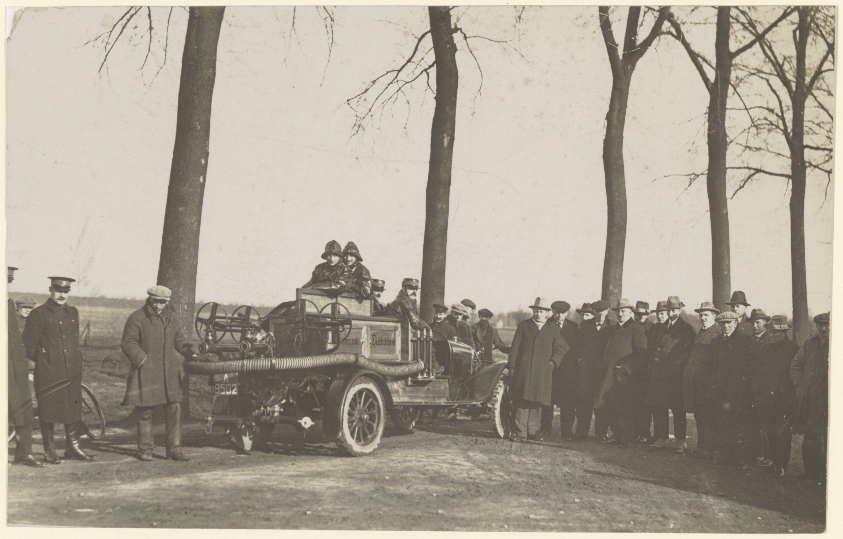 De Dubbeldamse motorbrandspuit A 9502 met spuitgasten en belangstellenden aan de …