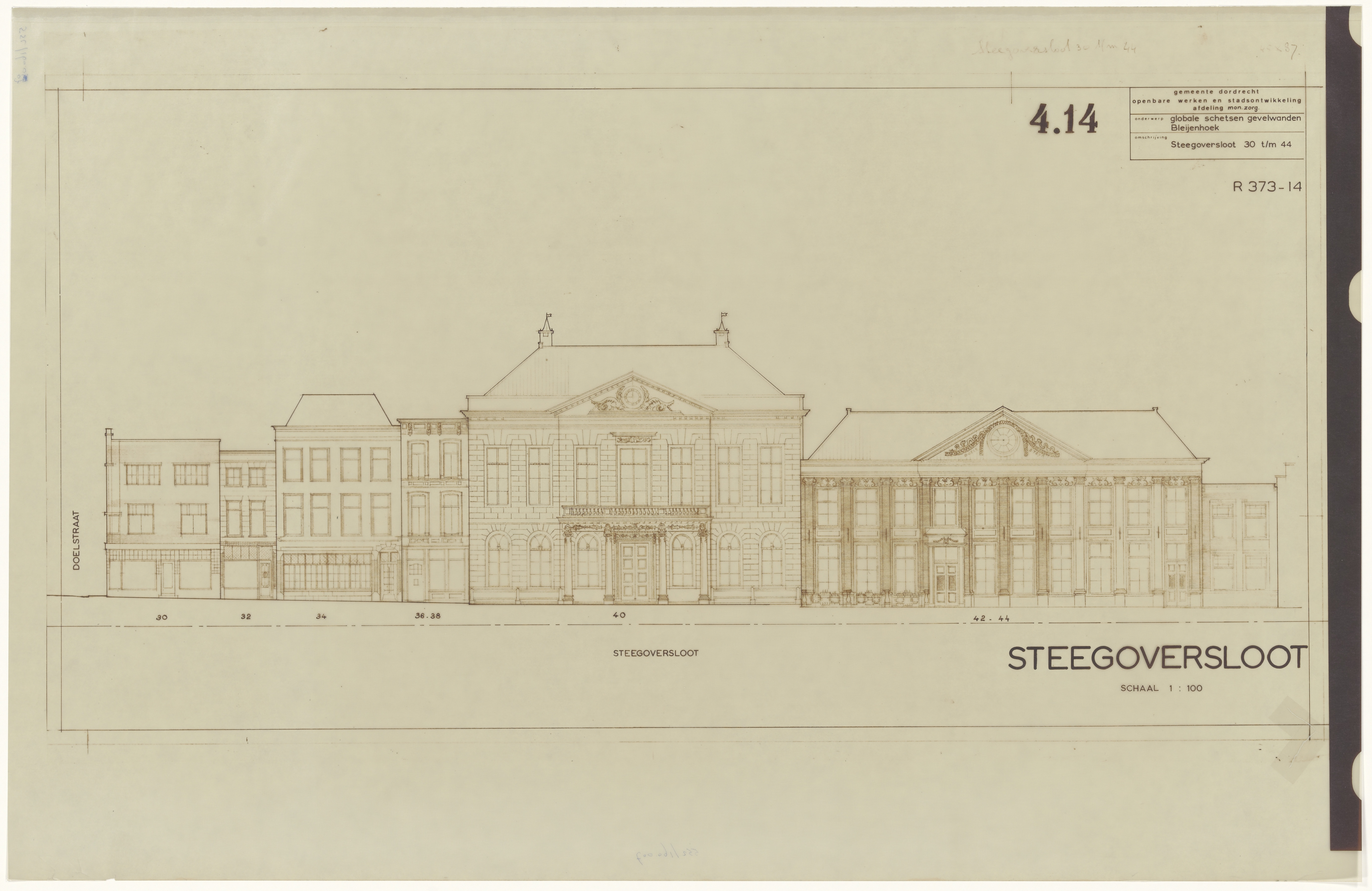 - Globale schetsen van de gevelwand van Steegoversloot noordzijde nrs. 30 - 44.
