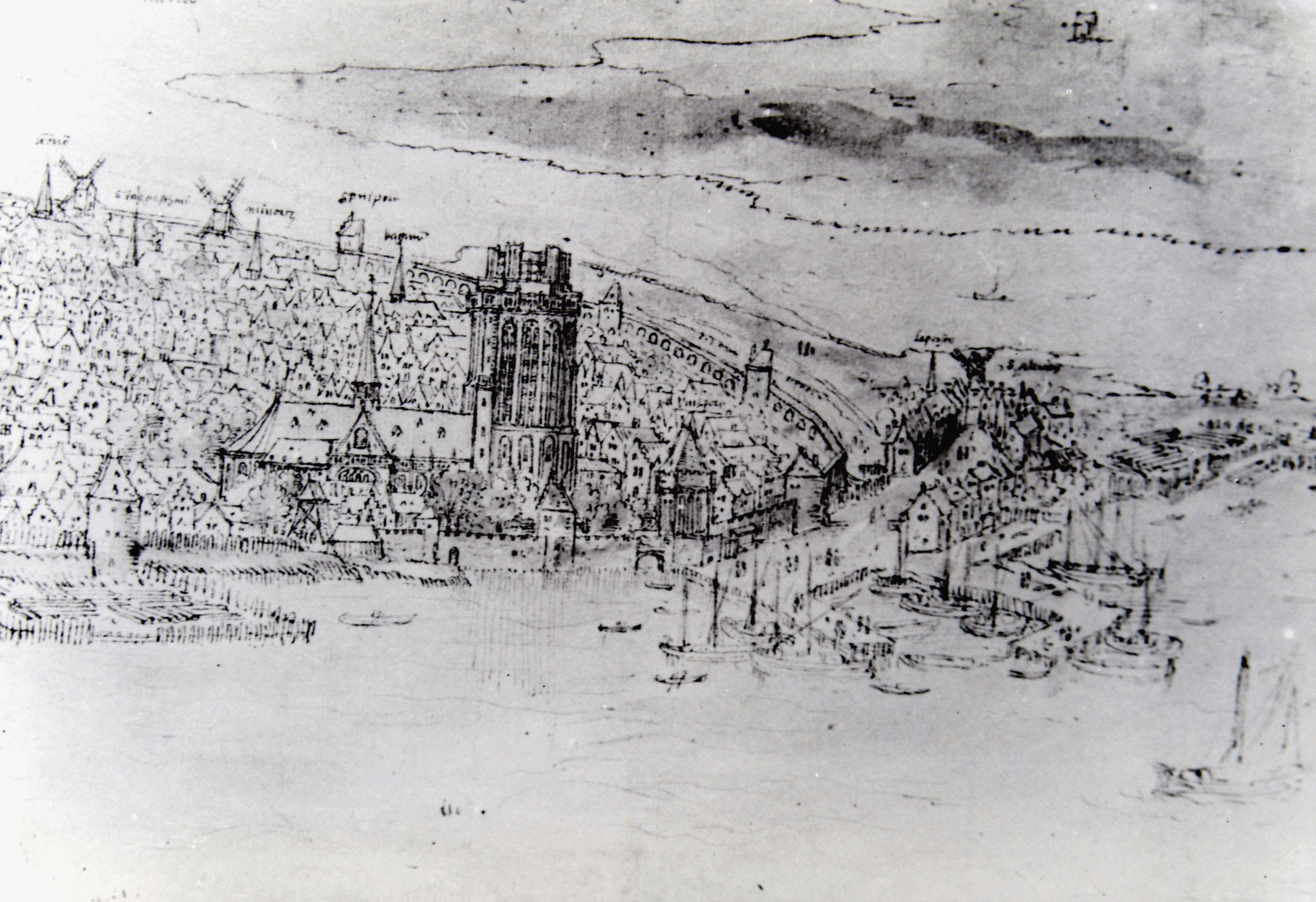 Uitsnede van een tekening van Anthonie van Wijngaarden van het westelijk deel van Dordrecht.