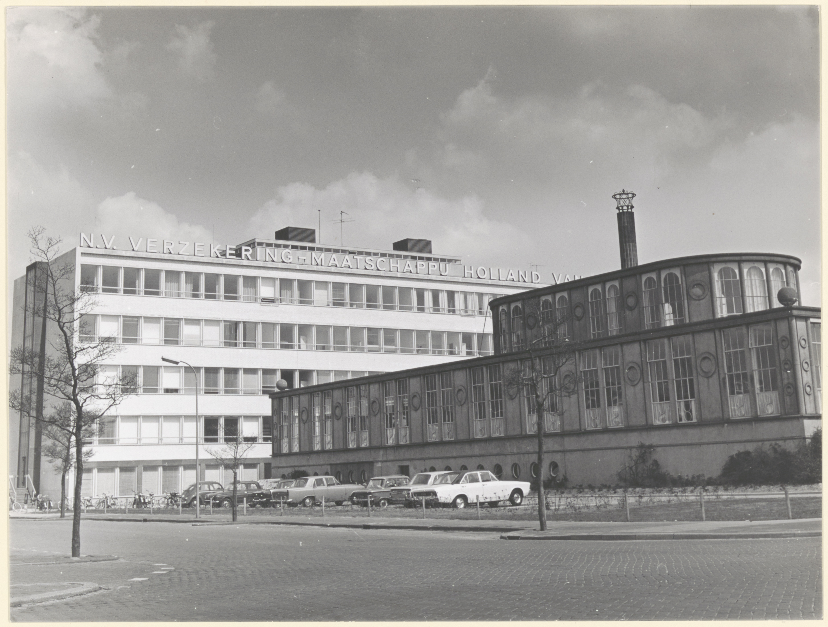 Het nieuwe kantoorgebouw van Verzekeringsmaatschappij Holland aan de Kilwijkstraat; ervoor het oude gebouw aan de Burgemeester de Raadtsingel. Links de Aert de Gelderstraat.