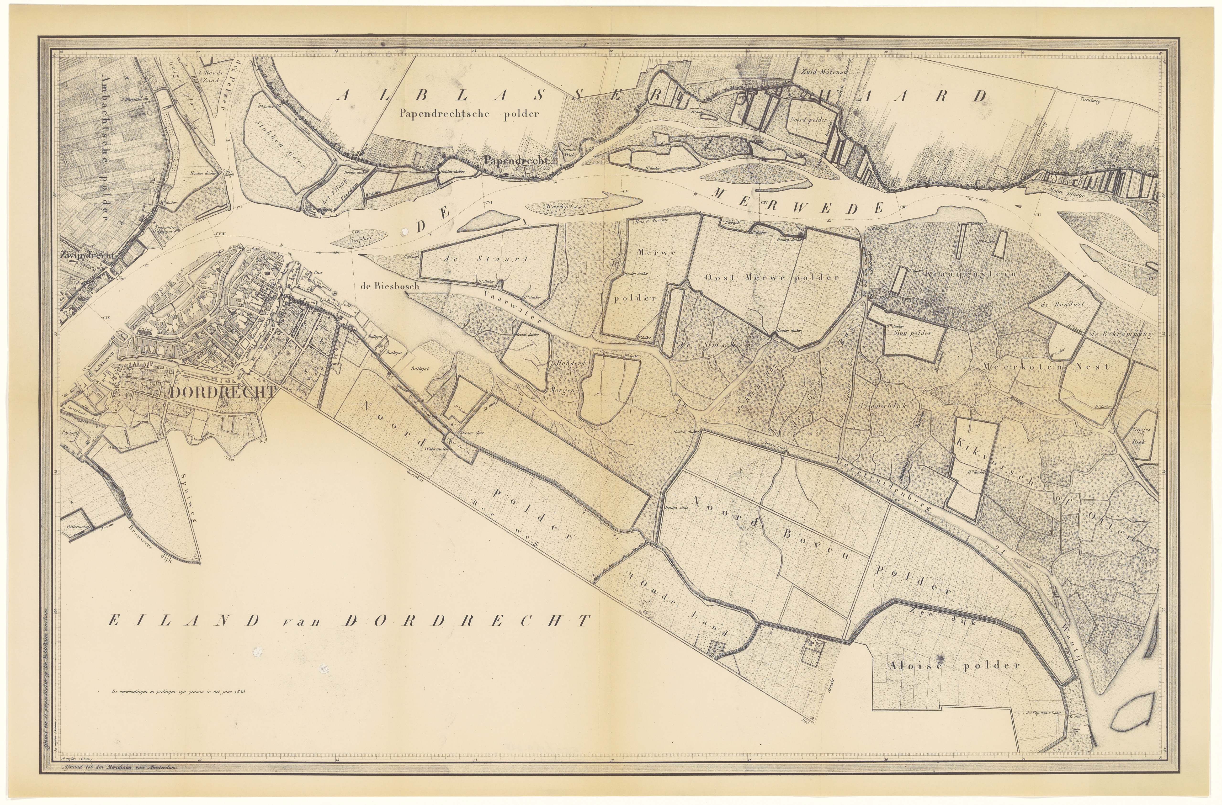- Plattegrond van de stad Dordrecht en een groot gedeelte van de Staart, met oevermetingen en peilingen in de rivier de Merwede.