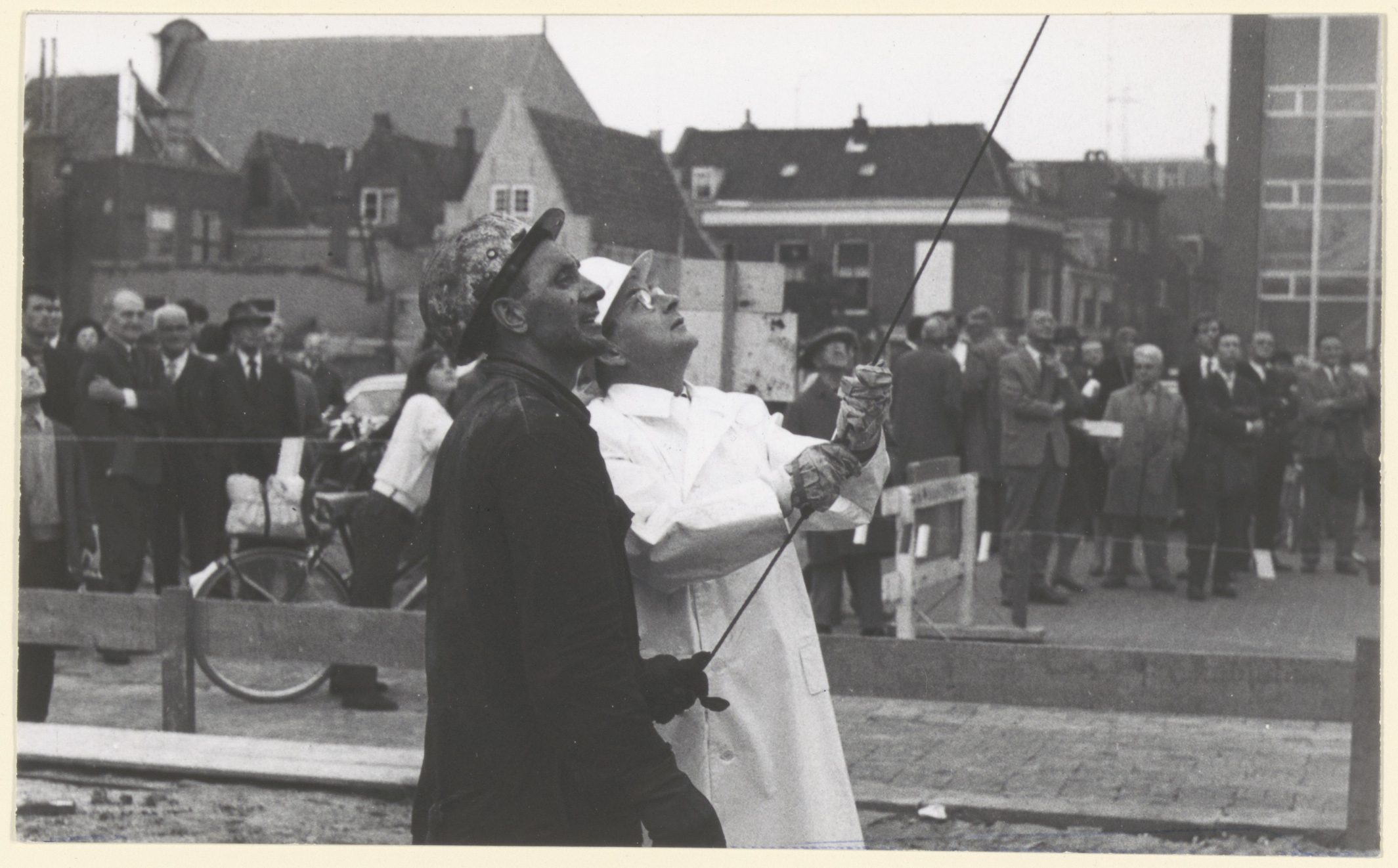 - Burgemeester J.J. van der Lee slaat de eerste paal van vijf winkelpanden die aan de zuidzijde van het Statenplein moeten verrijzen. Linksachter de Augustijnenkerk en nog wat oude bebouwing.