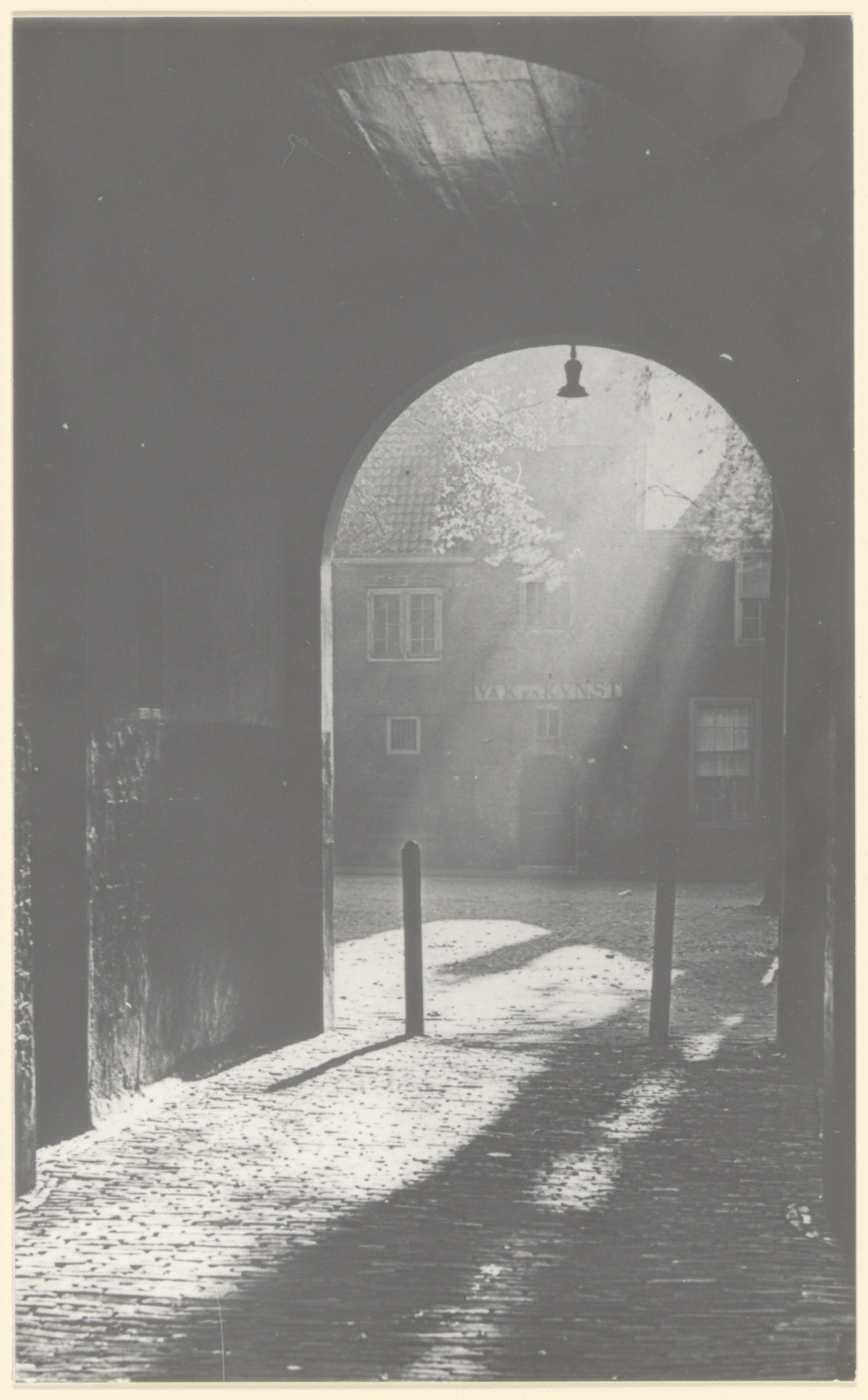 - Gebouw van Vak en Kunst in het Hof gezien vanuit het poortje naar de Voorstraat.