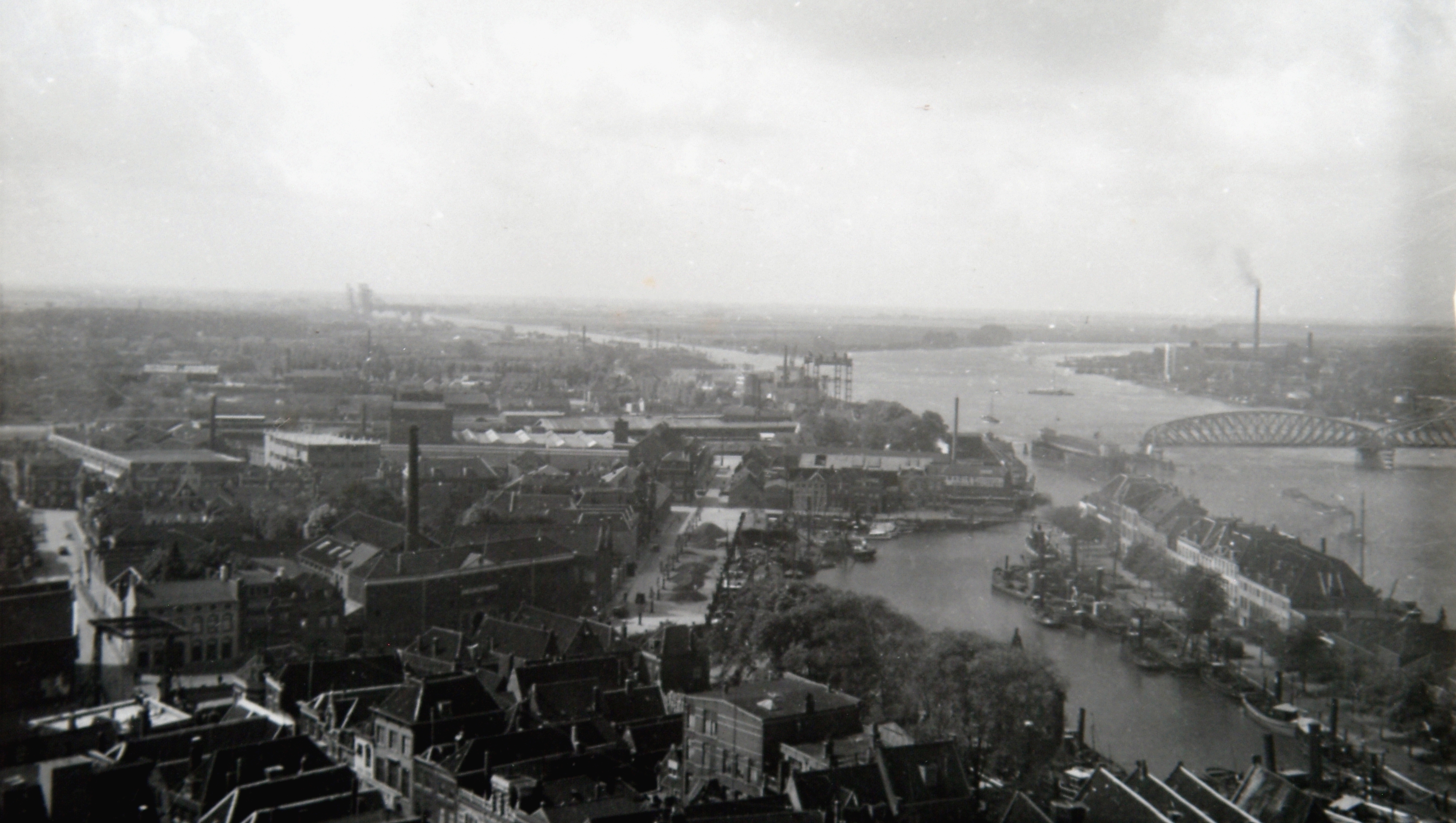 - Panorama vanaf de Grote Kerk over de omgeving van de Kalkhaven. Rechts de opengedraaide spoorbrug naar Zwijndrecht.