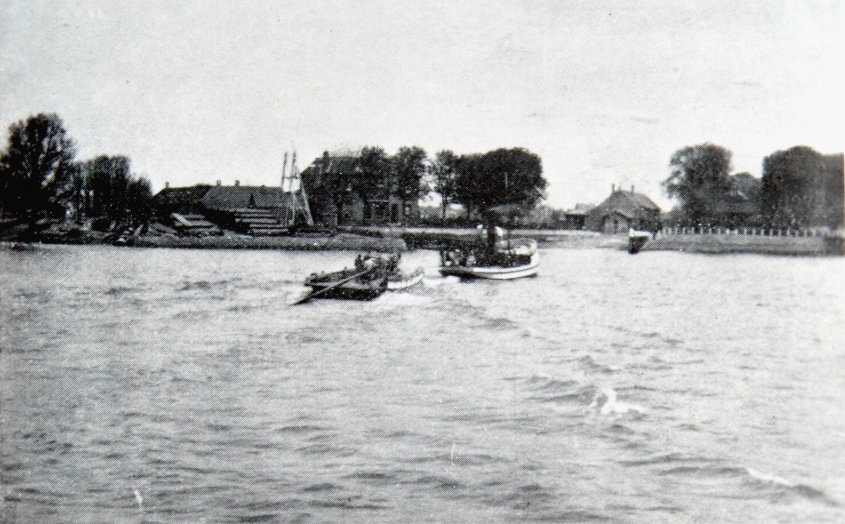 - De sleeppont aan het Papendrechts veer, die tot 26 maart 1911 in gebruik bleef. Op deze foto vaart de pont richting Papendrecht.