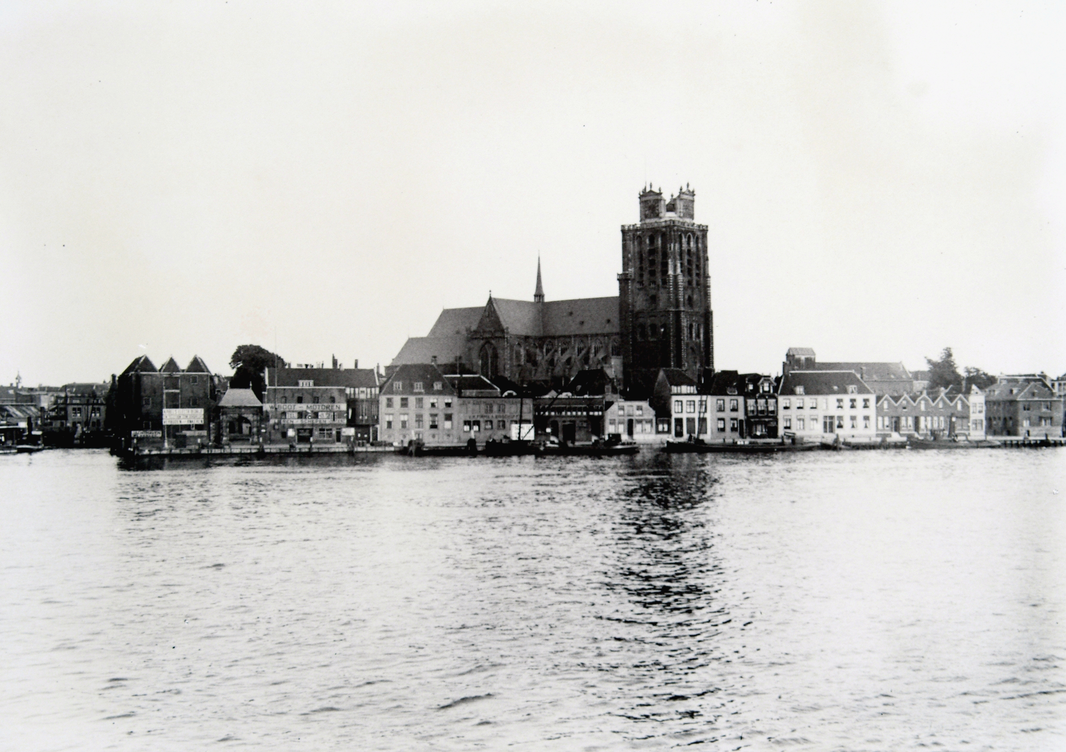 - Links op de hoek bij de ingang van de Nieuwe Haven staat pakhuis Rusland, daarnaast de Catrijnepoort. Panden langs de rivier staan aan de Hooikade. Het hoge dak rechts van de Grote Kerk is van meelfabriek Van de Kluizenaar en Van Pelt aan het Maartensgat.