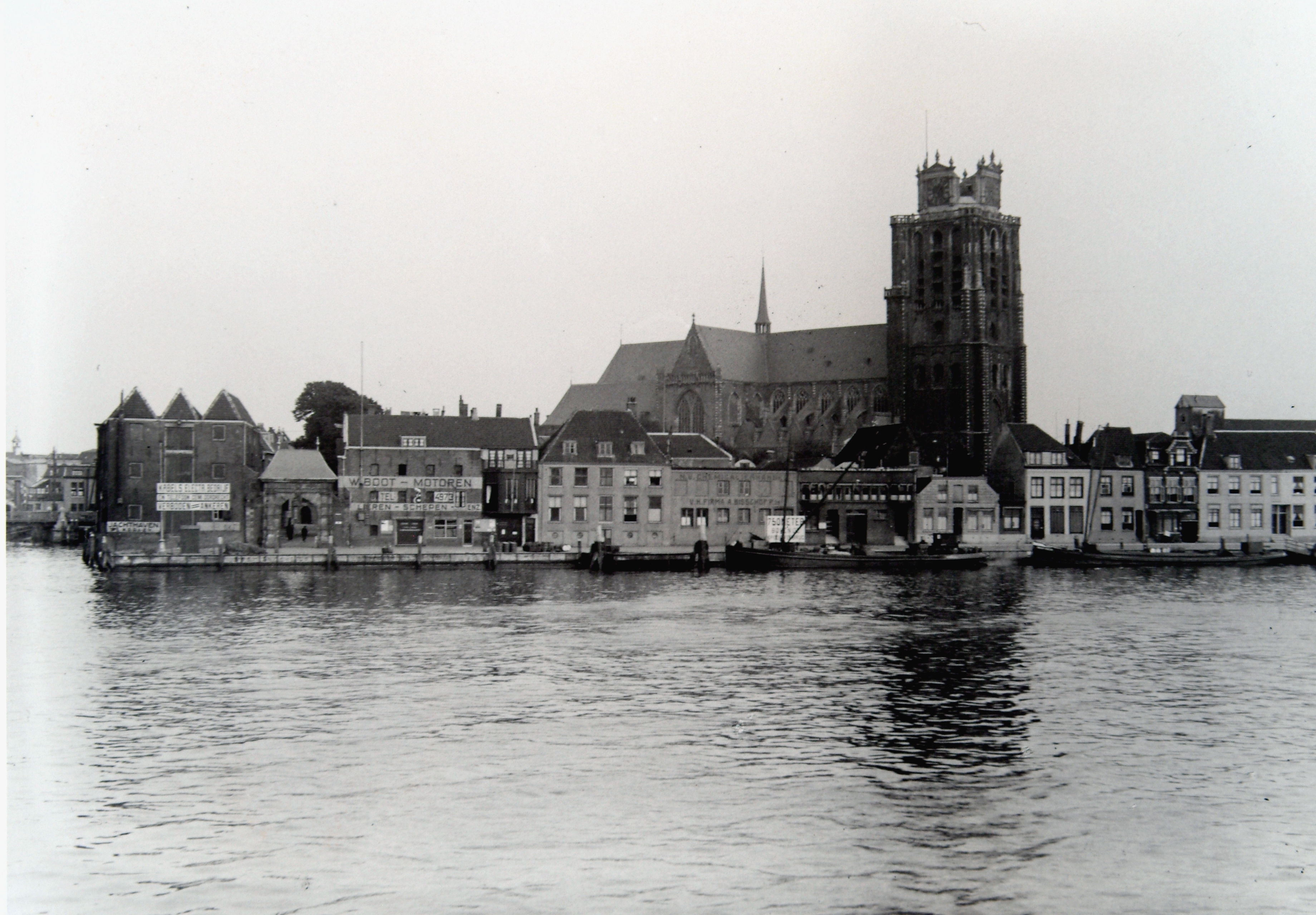 - Links op de hoek bij de ingang van de Nieuwe Haven staat pakhuis Rusland, daarnaast de Catrijnepoort. Panden langs de rivier staan aan de Hooikade. Het hoge dak rechts van de Grote Kerk is van meelfabriek Van de Kluizenaar en Van Pelt aan het Maartensgat.