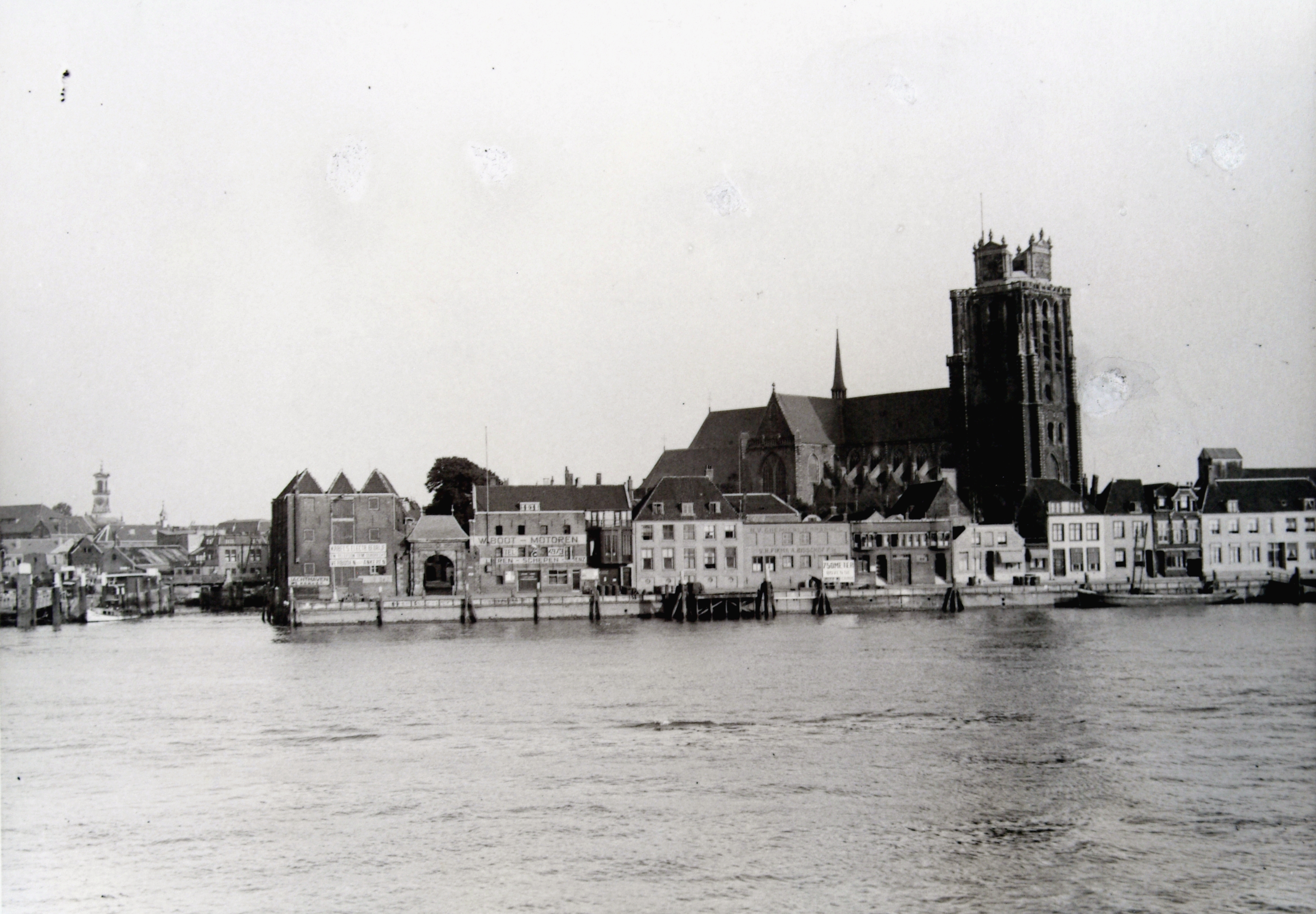 - Links op de hoek bij de ingang van de Nieuwe Haven staat pakhuis Rusland, daarnaast de Catrijnepoort. Panden langs de rivier staan aan de Hooikade. Het hoge dak rechts van de Grote Kerk is van meelfabriek Van de Kluizenaar en Van Pelt aan het Maartensgat. Geheel links de toren van het stadhuis.