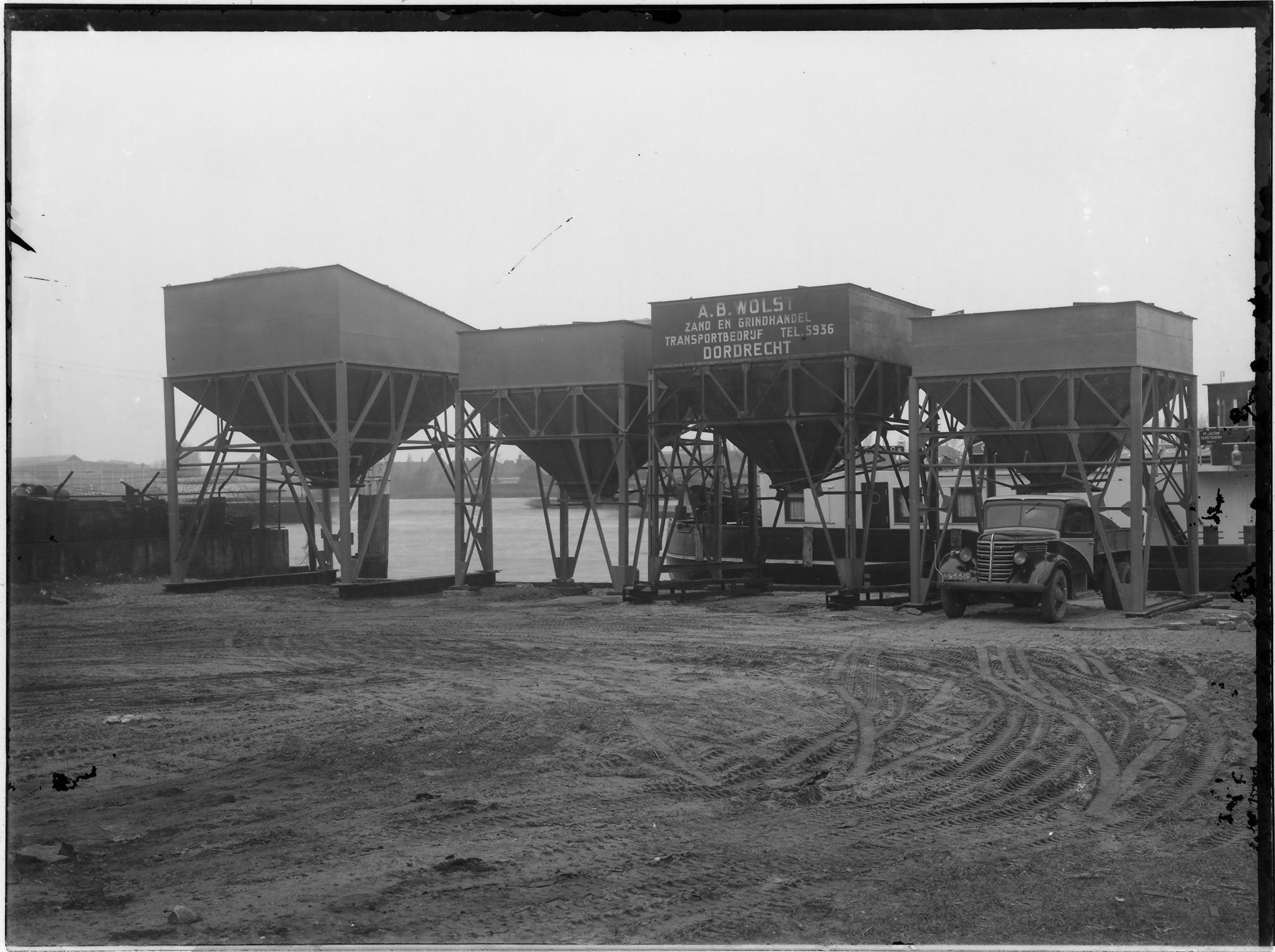 4 overlaadtrechters van de fa. A.B. Wolst in zand en grind aan de 's-Gravendeelsedijk