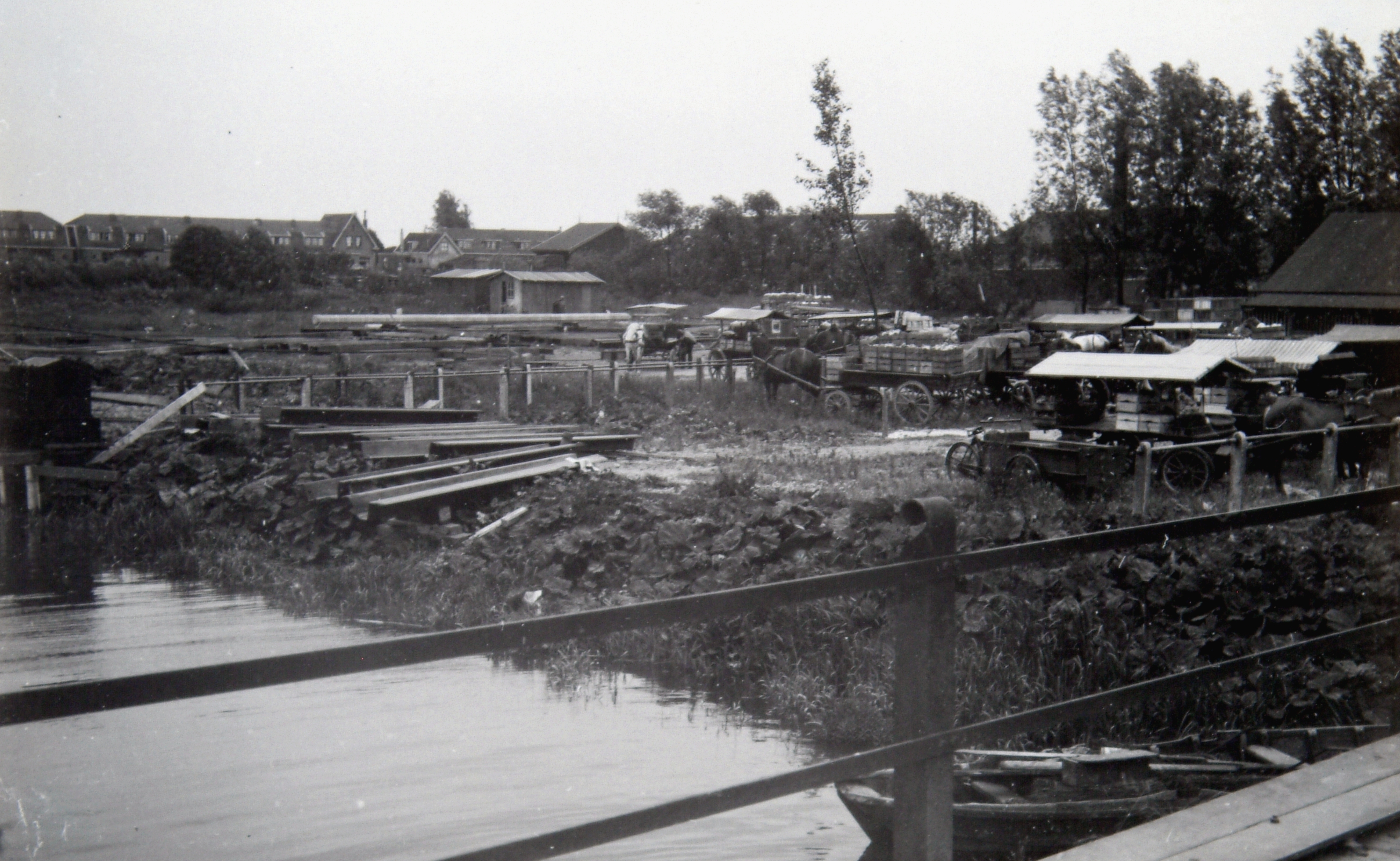 - Terrein van de voormalige groenteveiling aan het Papegat. Paard en wagens staan geladen met kisten. De huizen links staan aan de Weeskinderendijk.