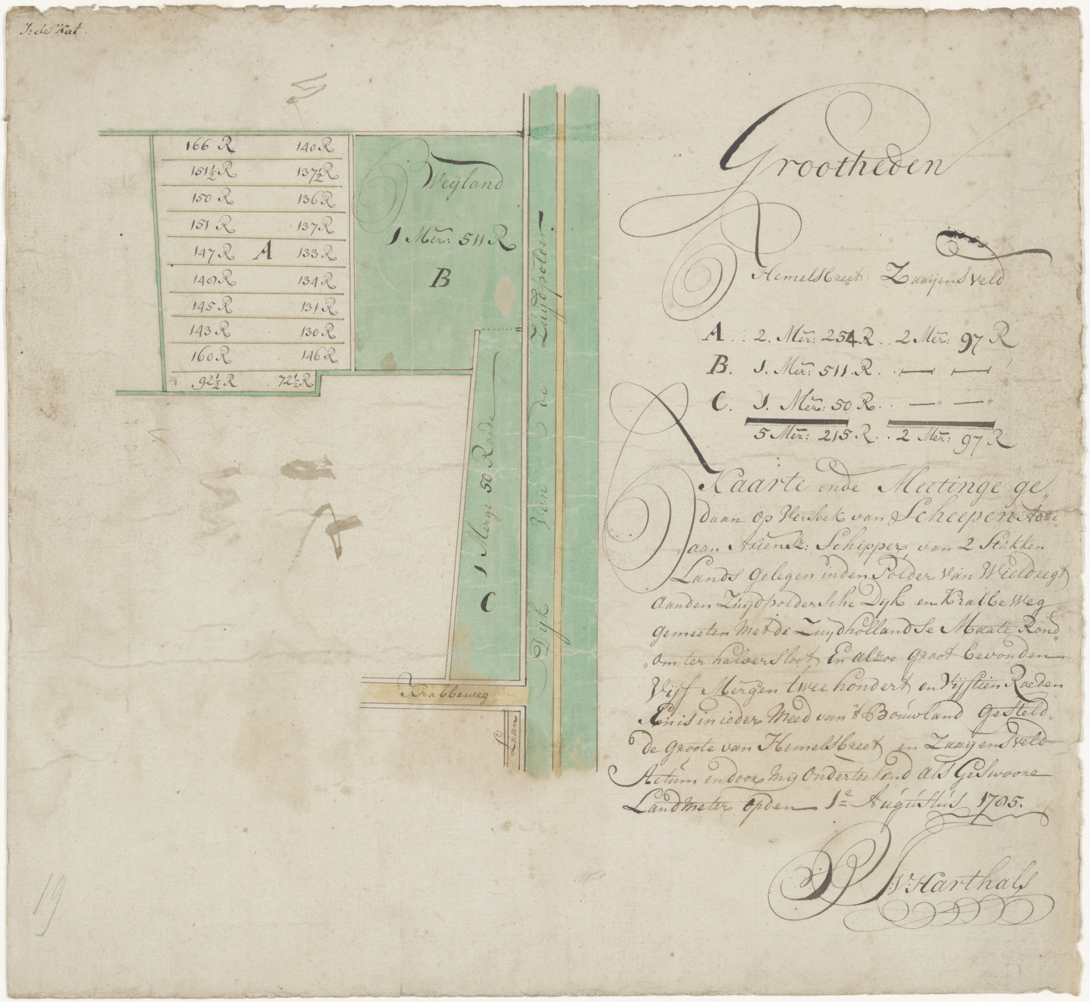 - Kaart van drie stukken land ten westen van de Zuidendijk en ten noorden van de Krabbeweg. Een van de drie stukken is opgedeeld in kavels, met aanduiding van de oppervlaktes.