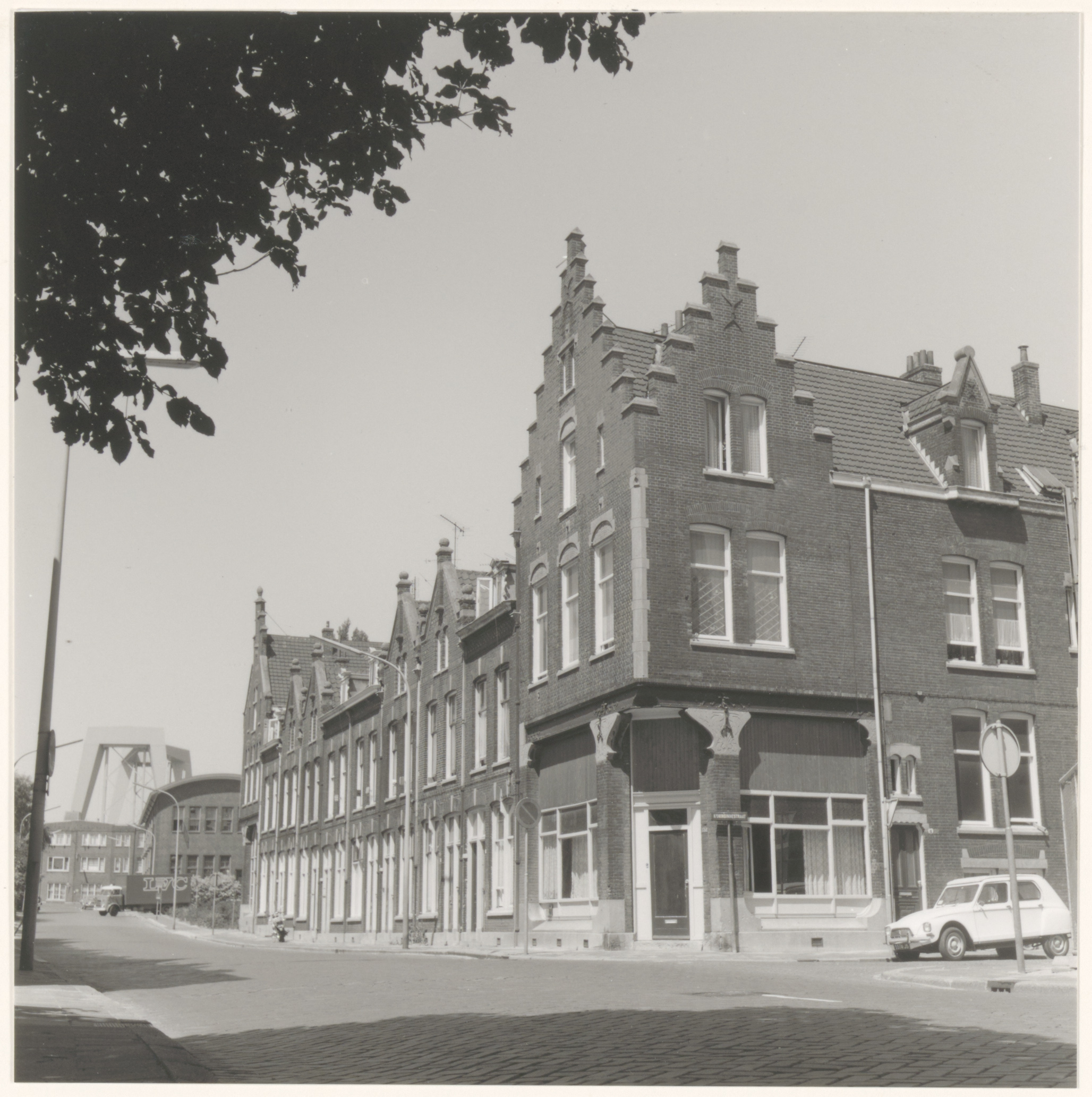 - De Havenstraat gezien naar het westen, richting de kantine van de Victoria-fabriek en de Lage Bakstraat. Daarachter de heftoren van de spoorbrug over de Oude Maas.