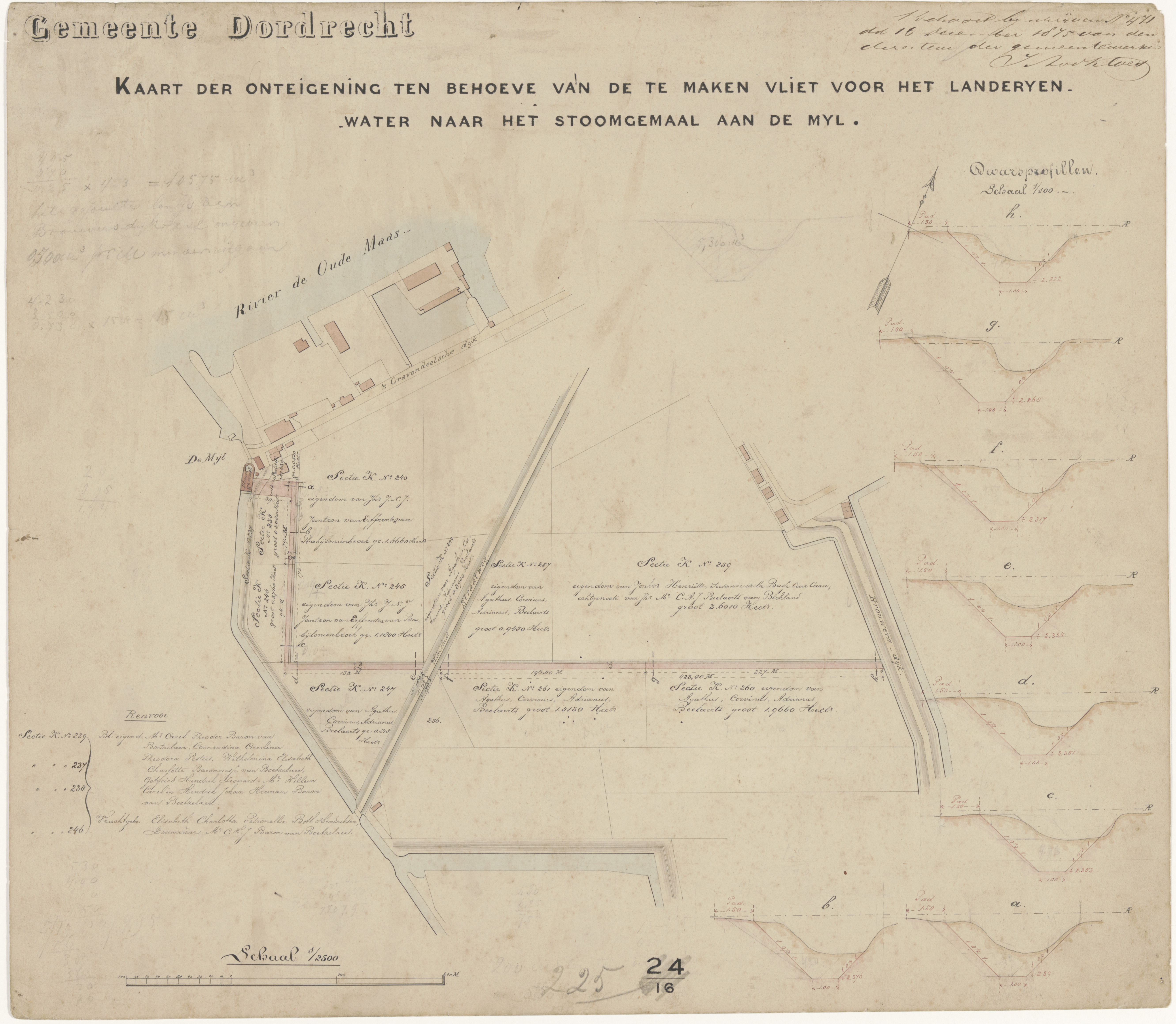 Plattegrond en 8 (9) profielen van de te maken vliet naar het gemaal aan De …