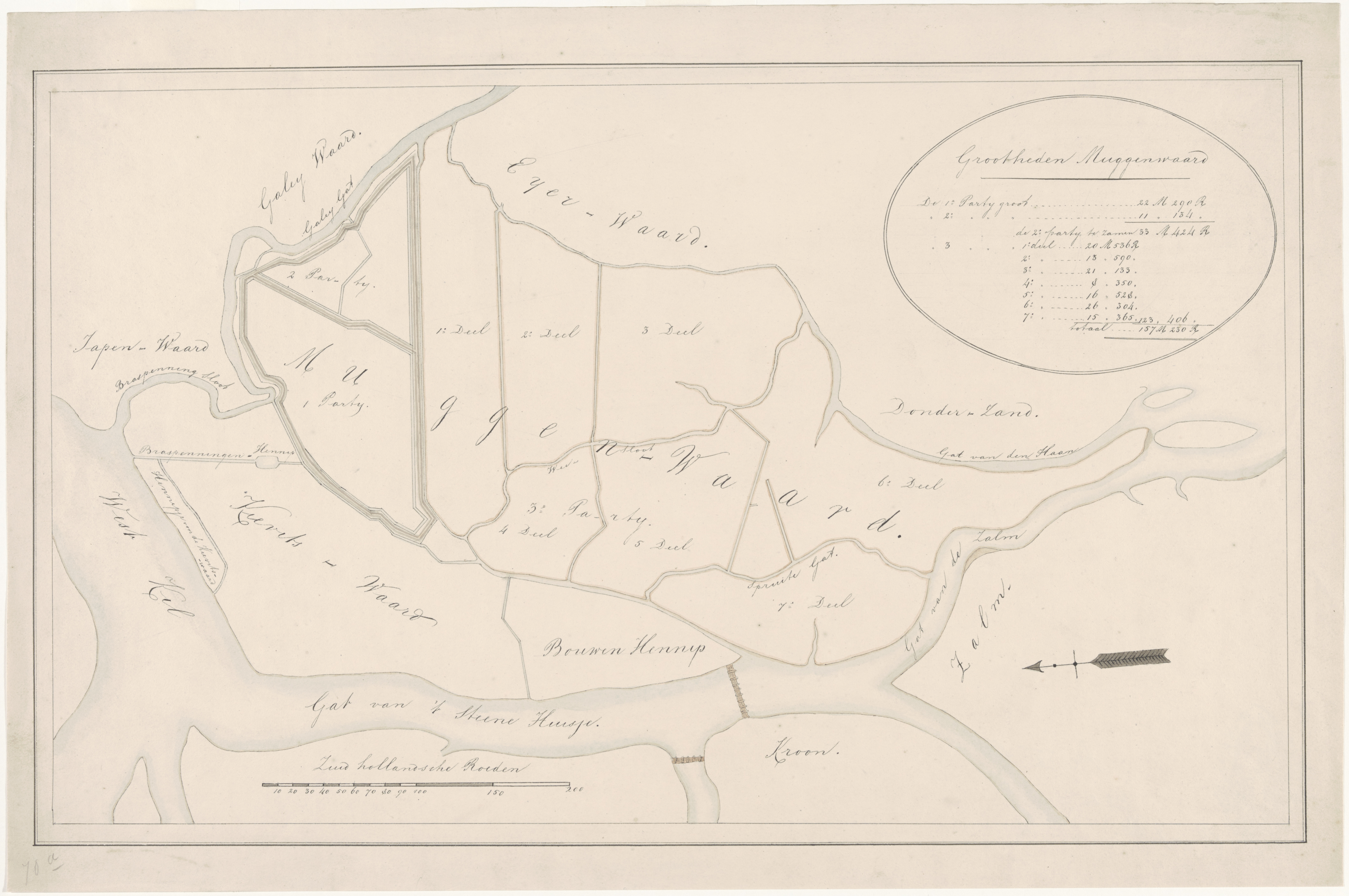 - Kadastrale kaart van de Muggenwaard in de Brabantse Biesbosch met opgave van oppervlaktes van de verschillende delen.